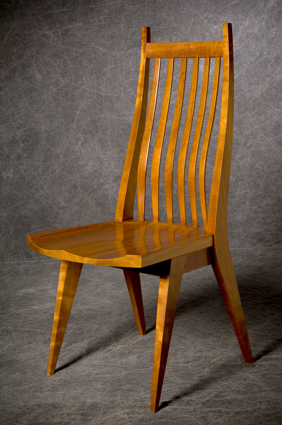 The key elements are comfort and ergonomics, the tilt from front to back that governs the comfort of a chair, he explains. The weak spot is the joint where the seat meets the back leg. “I started with that joint. In my chairs, that joint has to be as strong as possible,” he says, tilting backward in the chair to prove his point. So much goes into engineering the perfect chair that even after nearly four decades in the business, Thomas has just two basic versions that are timeless and incorporate the Maloof style of deep, dished-out seat. “I have a design that I can guarantee,” he says. “It isn’t going to fail.” His two versions are different in comfort and style, and he can change the back and front legs or the color to match a client’s needs.