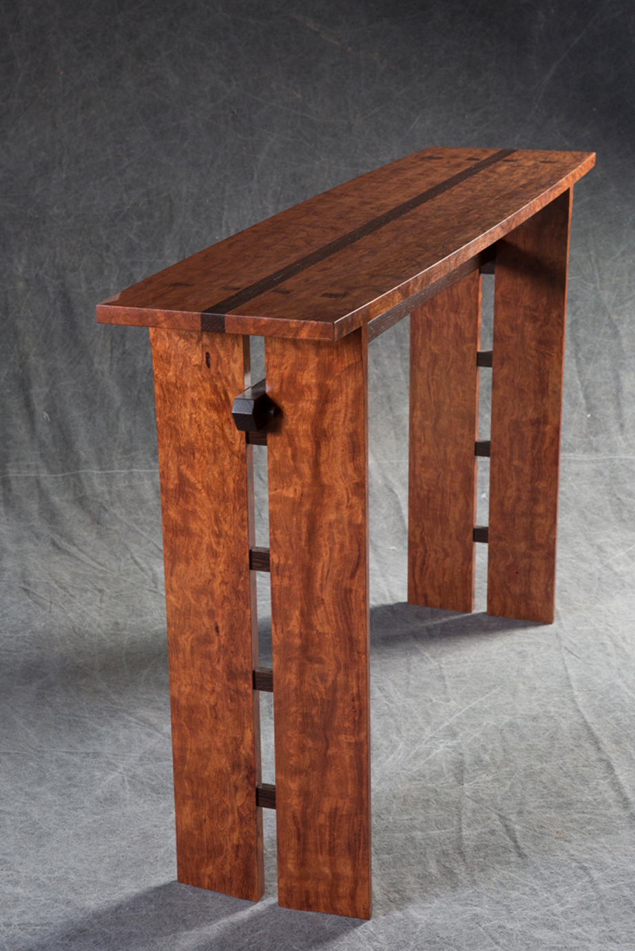 While there is no doubt that Thomas’ pieces are works of art, when he speaks of his process, he sounds like less of a designer and more of a gear-head, an engineer. For him, the process is brass tacks, the “nitty gritty of how we’re going to make it.” He draws his designs to scale on graph paper, incorporating clean lines and multiple colors and species of wood in nearly every piece. “I use dark wood as an accent, and a combination of others to achieve a look, to achieve the ultimate goal of a design,” Thomas says.