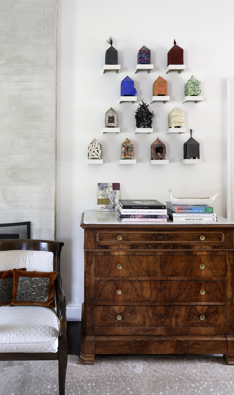 As one might expect in the home of a gallerist, beloved art pieces are found in every room. But between the large-scale paintings and the antique drawings in gilded frames, there are large swaths of wall that serve as resting places for the eye.