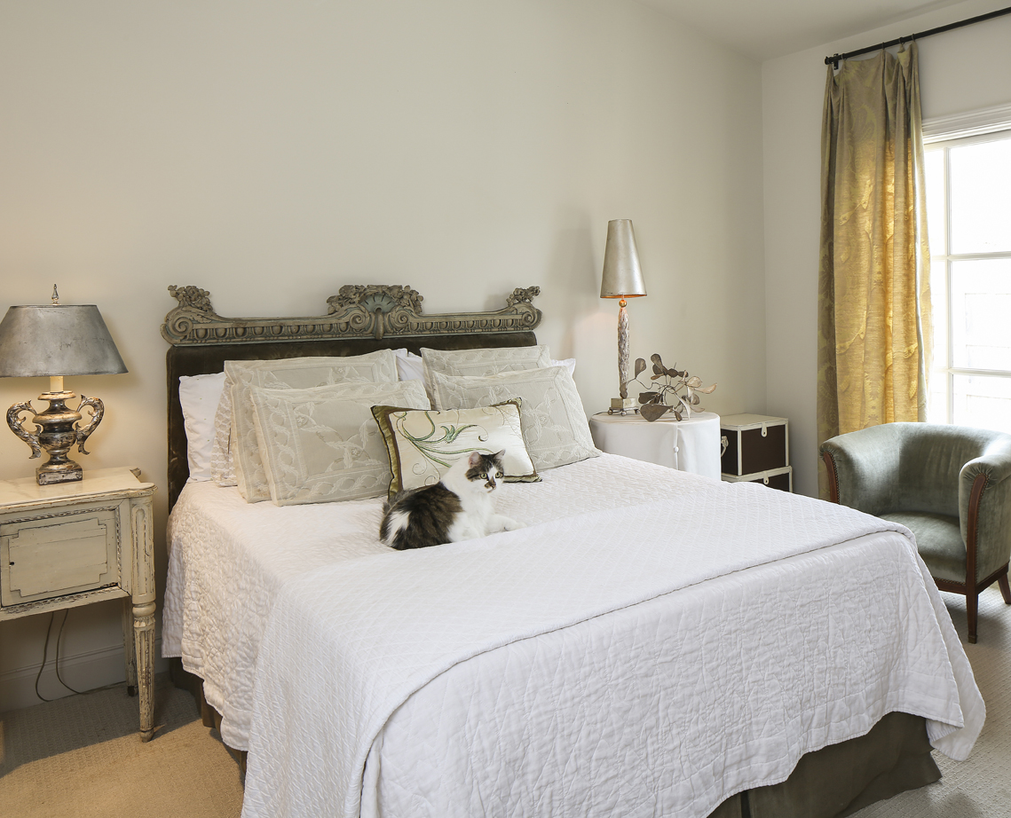 “I like a lot of negative space,” she says while walking through the master bedroom, which features a French antique bed but no art above its low carved headboard.
