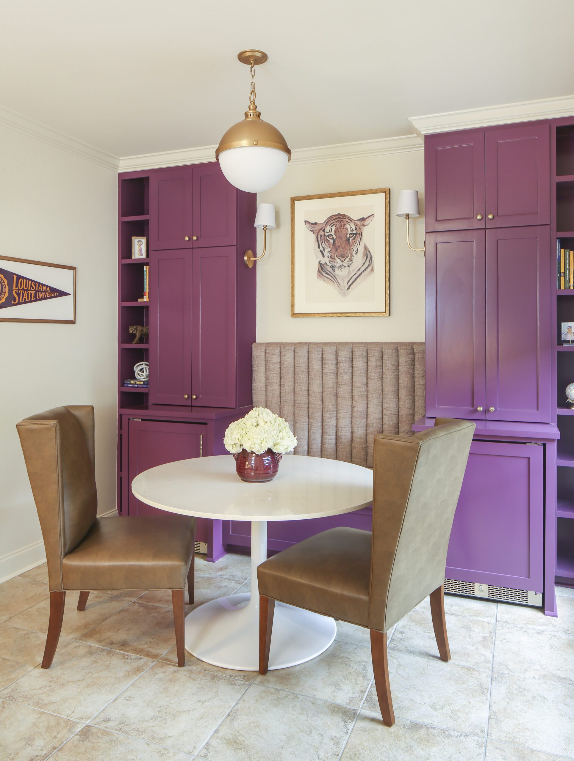 With design partner Lauren LeMaster, in addition to a team of Baton Rouge-based vendors including Jeff Raybon Construction, Timberline Millworks and Denicola’s, the team took to transforming nearly every inch of the home. Utilizing a palette of purple and gold, of course, their focus was always on functionality for entertaining. Since the home sits almost on LSU’s campus, it is a hub for family and friends on gamedays. With this in mind, Blossman and LeMaster worked to optimize seating in spaces like the dining room where they placed a custom-built banquette, and the living room, which sits 12 thanks to upholstered ottomans and a pair of couches.