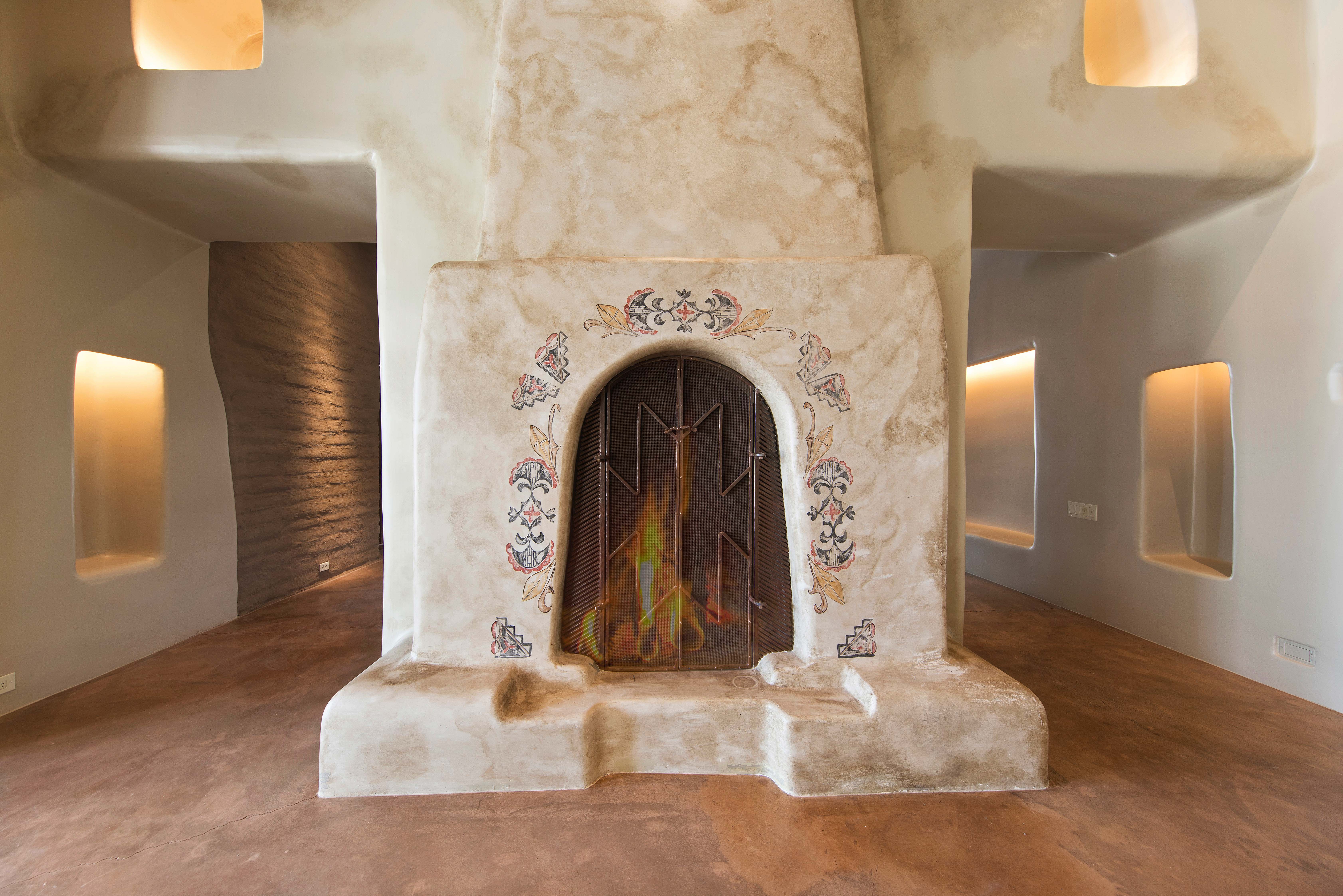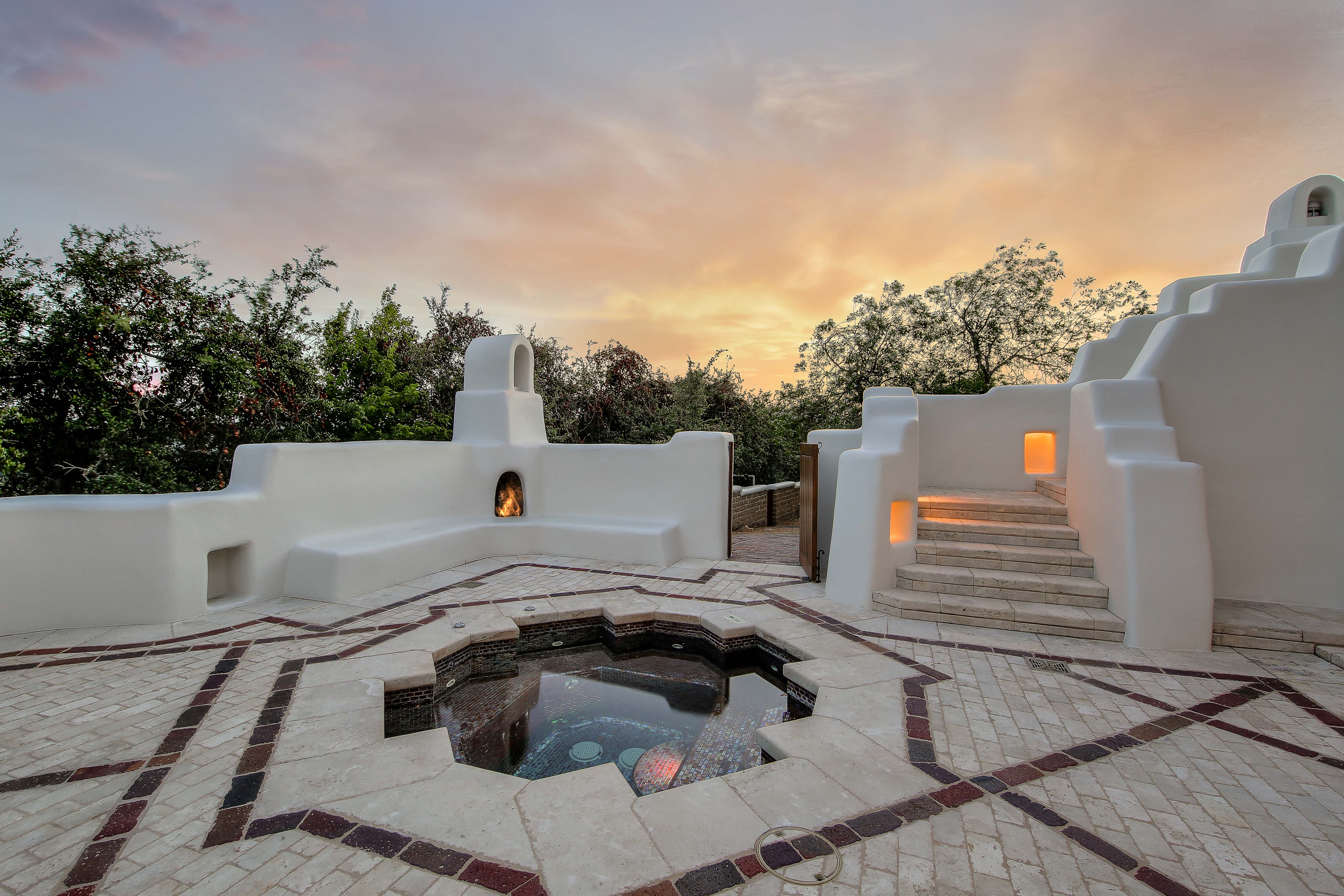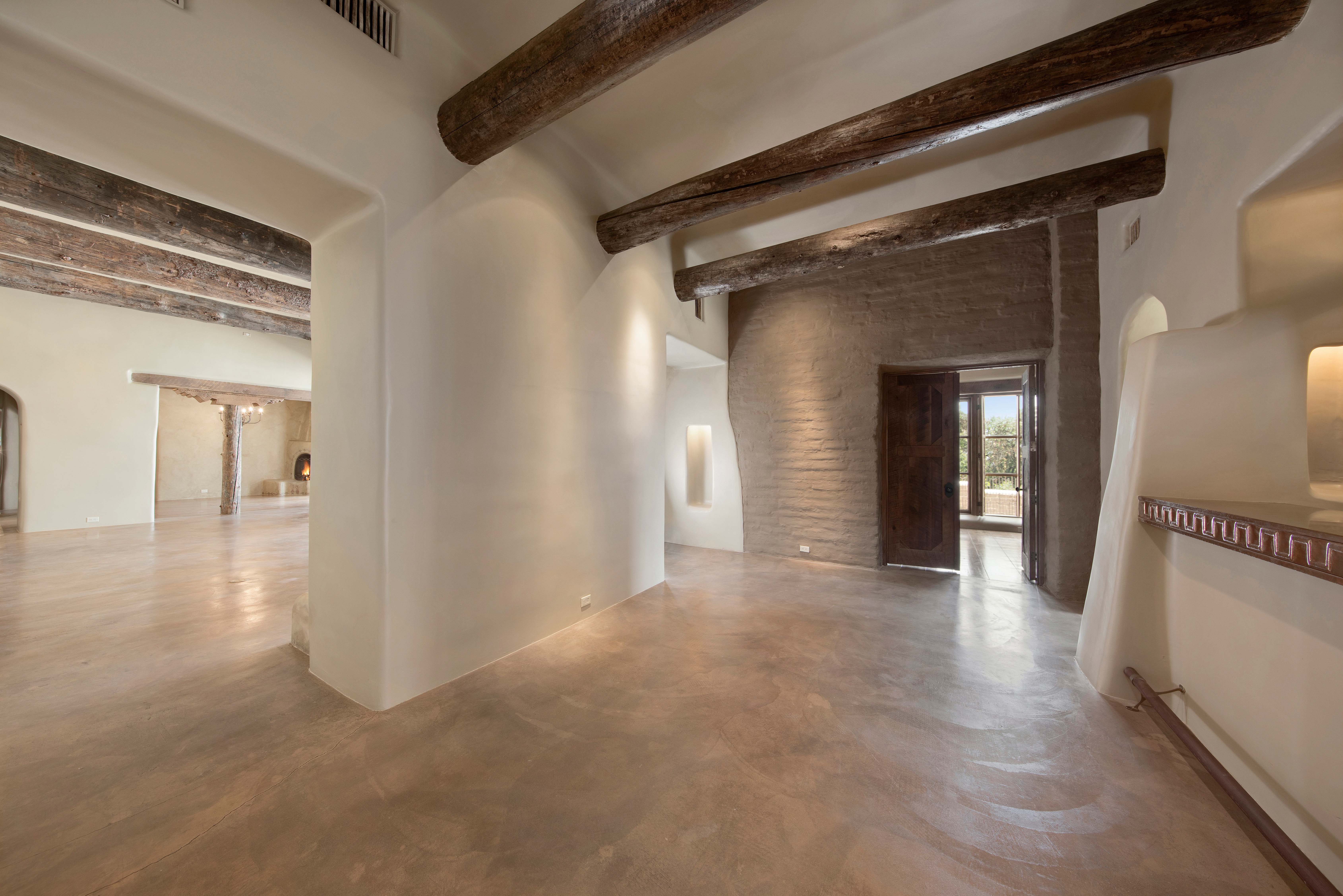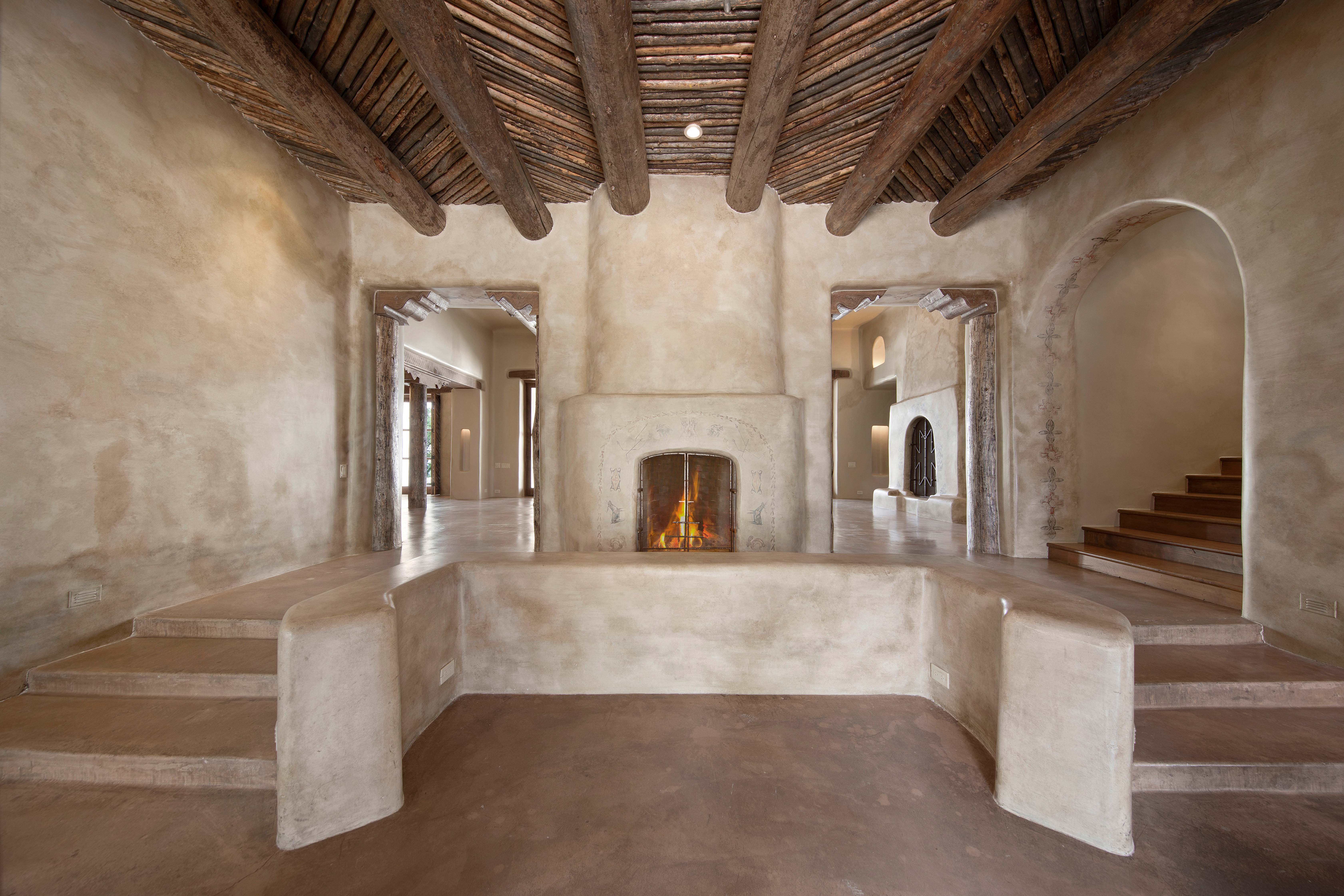 A home whose elements blend seamlessly into the property, structures like the 14 hand-sculpted fireplaces act almost as sculptural elements as well as functional heating systems. A theme of warmth and nature reverberates throughout the home, found especially in places like the kitchen, dining venues, paved terraces and even the gym, with a steamy sauna to accompany it. The master suite includes separate his-and-hers bathrooms and closets, and even two separate fireplaces.