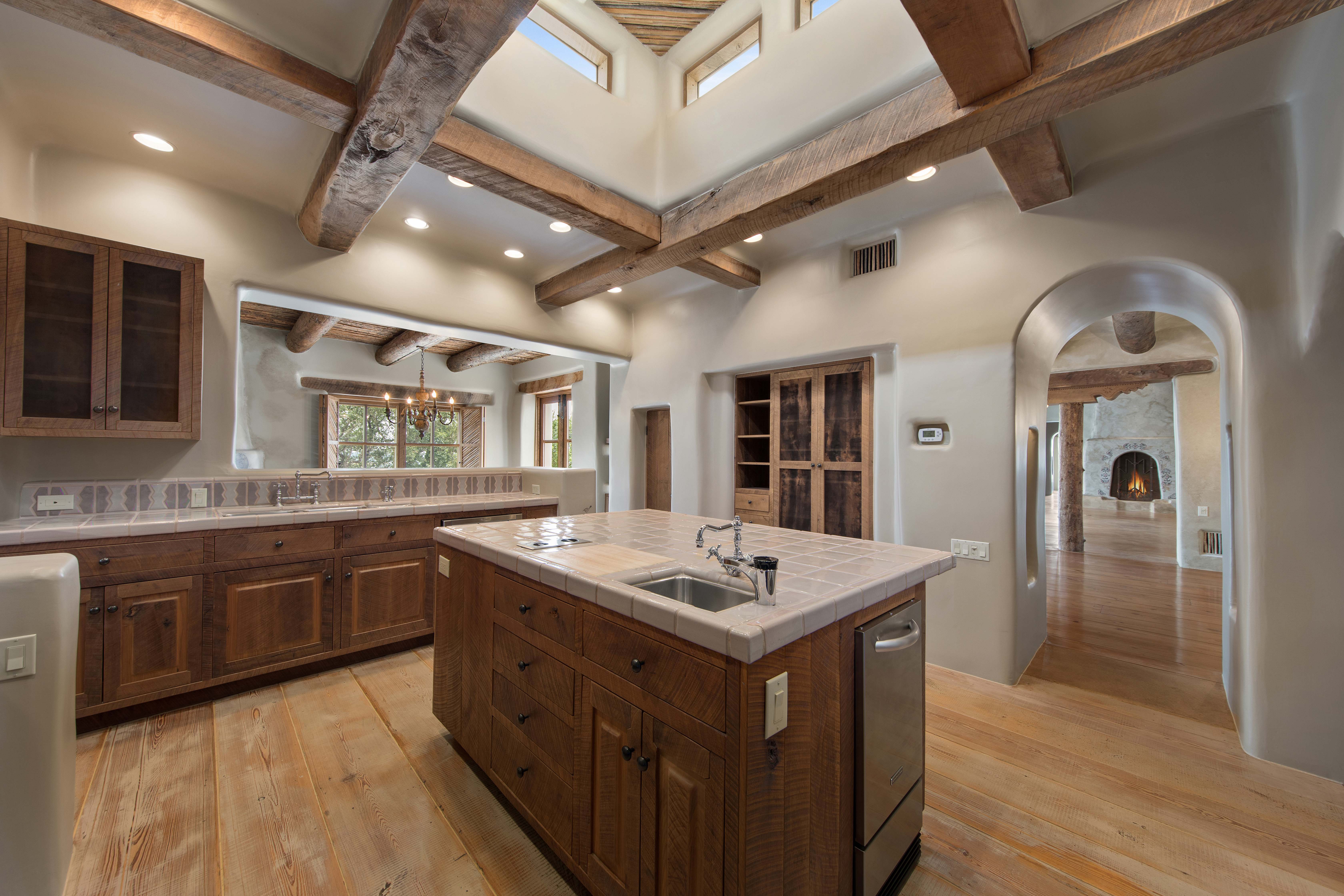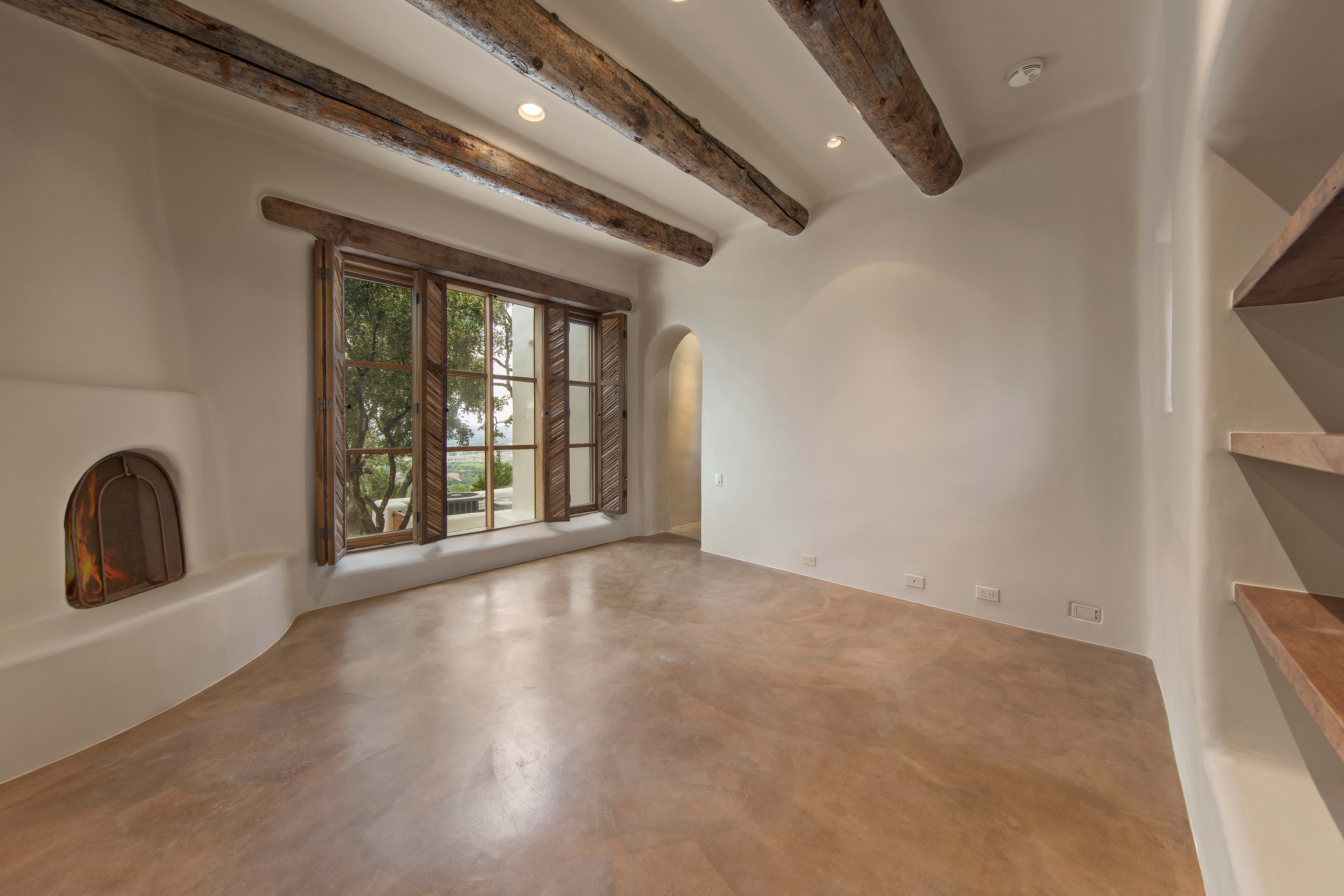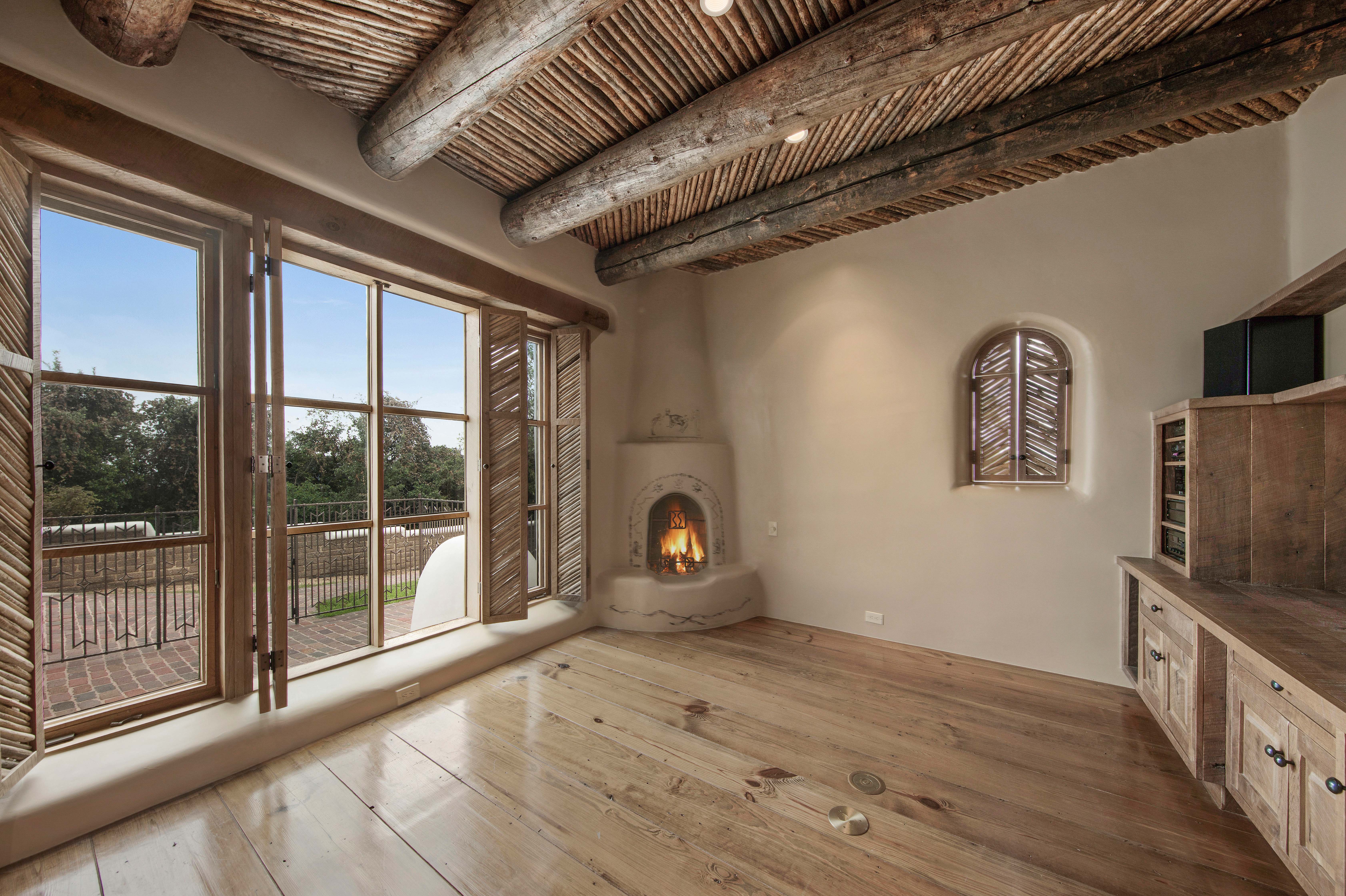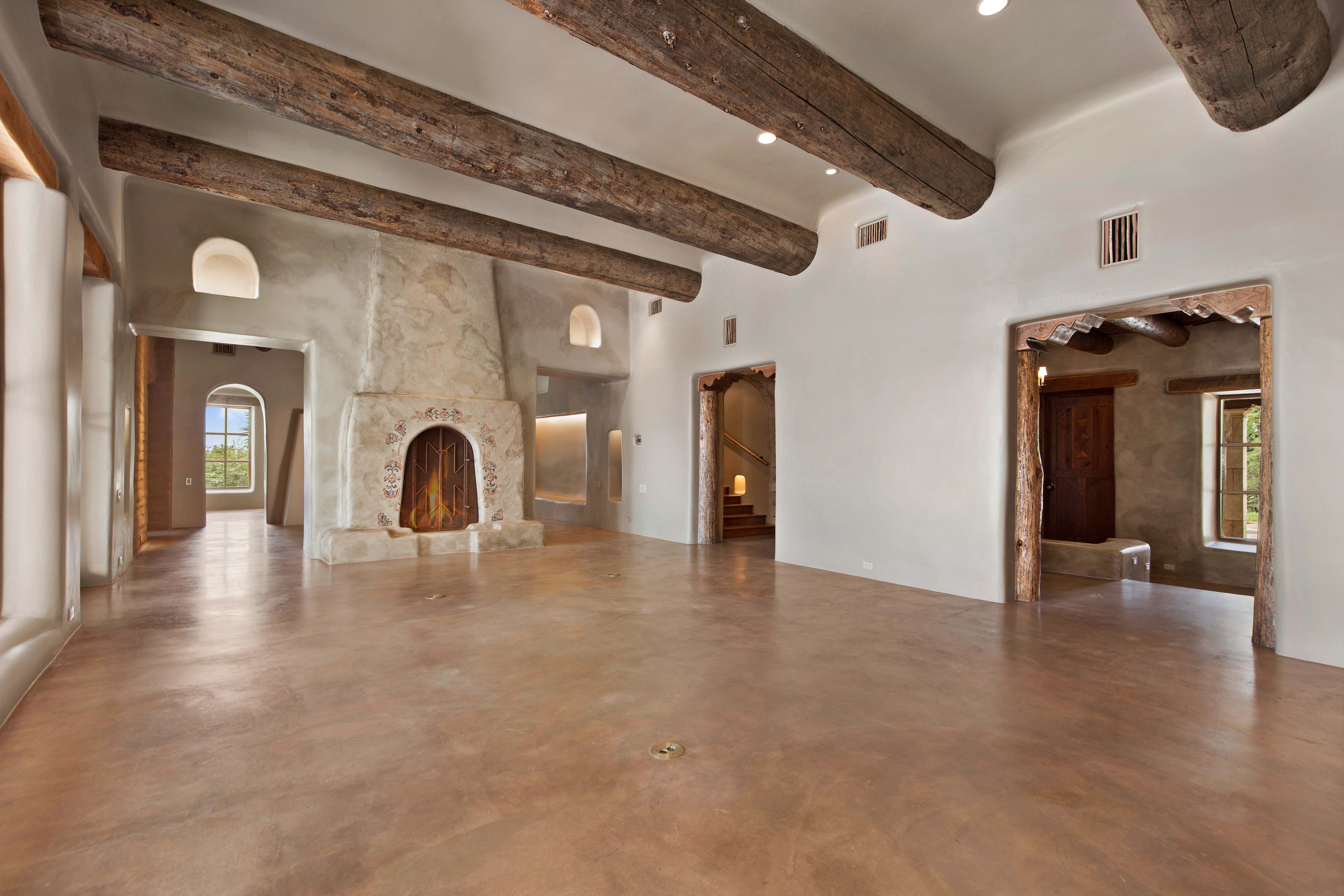 A home whose elements blend seamlessly into the property, structures like the 14 hand-sculpted fireplaces act almost as sculptural elements as well as functional heating systems. A theme of warmth and nature reverberates throughout the home, found especially in places like the kitchen, dining venues, paved terraces and even the gym, with a steamy sauna to accompany it. The master suite includes separate his-and-hers bathrooms and closets, and even two separate fireplaces.