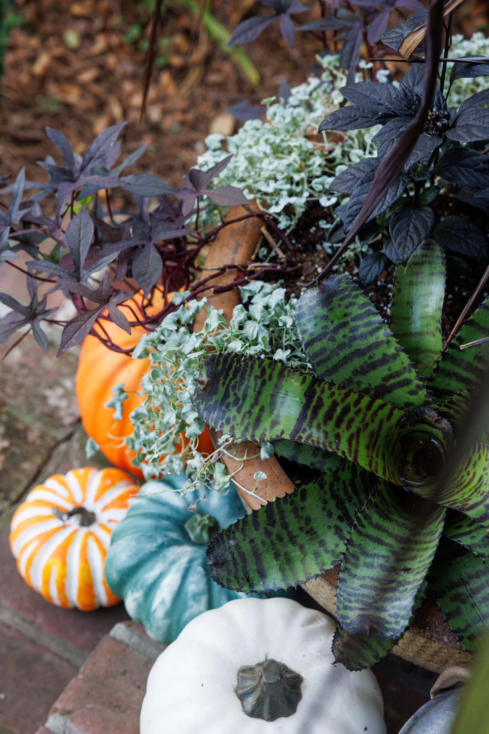 My personal favorite plant with black-hued foliage is the Norman Bates Neoregelia bromeliad. Its greenery with black striping is not only fit for Halloween but looks like a plant that would be growing in some far-off alien world.