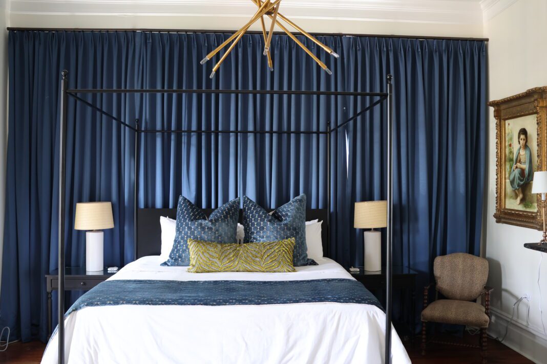 In both large bedrooms, custom king bed frames were made by New Orleans-based company Doorman Designs. Utilizing the classic four-poster design, these frames are clean-lined and effortlessly combining old and new, a goal of Branch and Wax. Beyond the bed, modern touches were carried upward with a brass Sputnik light fixture.