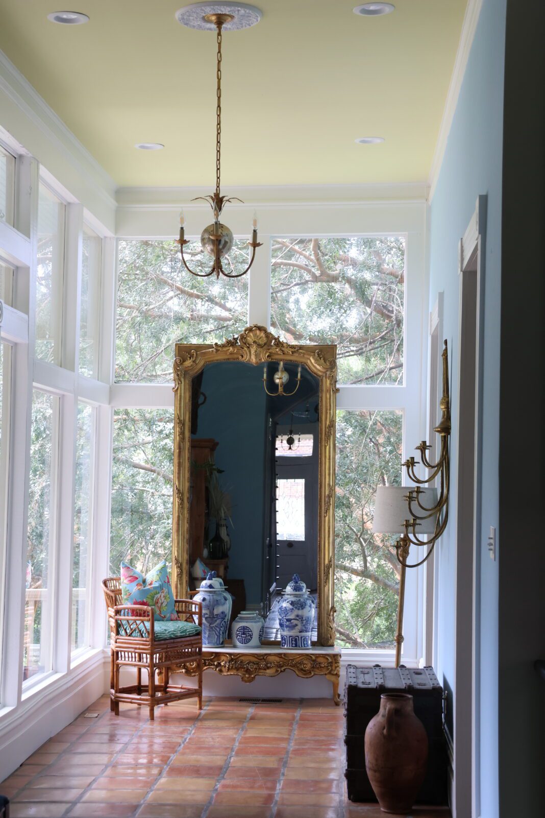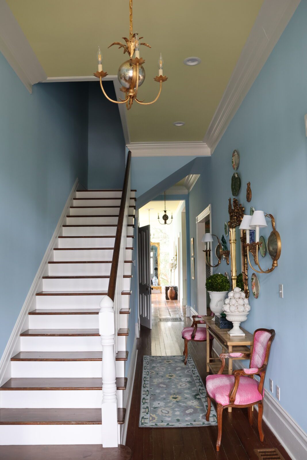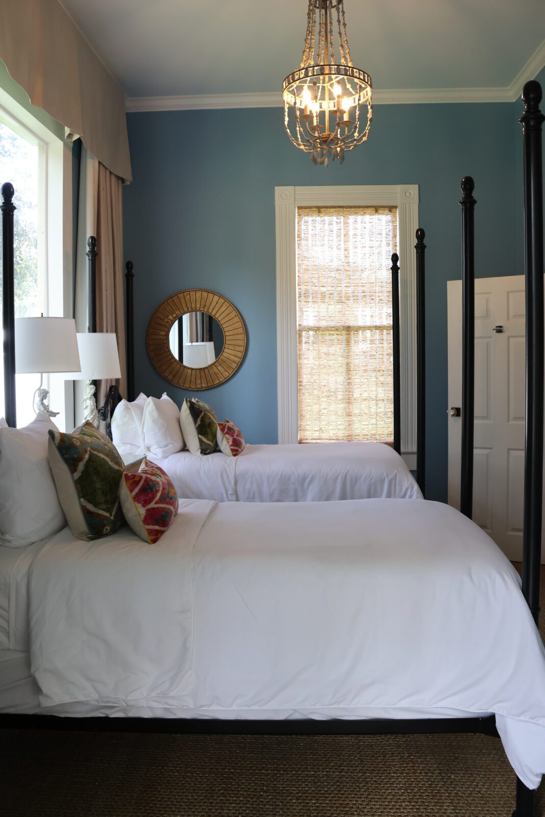 “The chandelier in the blue bedroom adds a touch of modern and something unexpected, but we kept the original molding around it,” Branch says. Mixing some of the original architecture and design elements with contemporary components helped to create that traditional yet playful style the duo was going for.