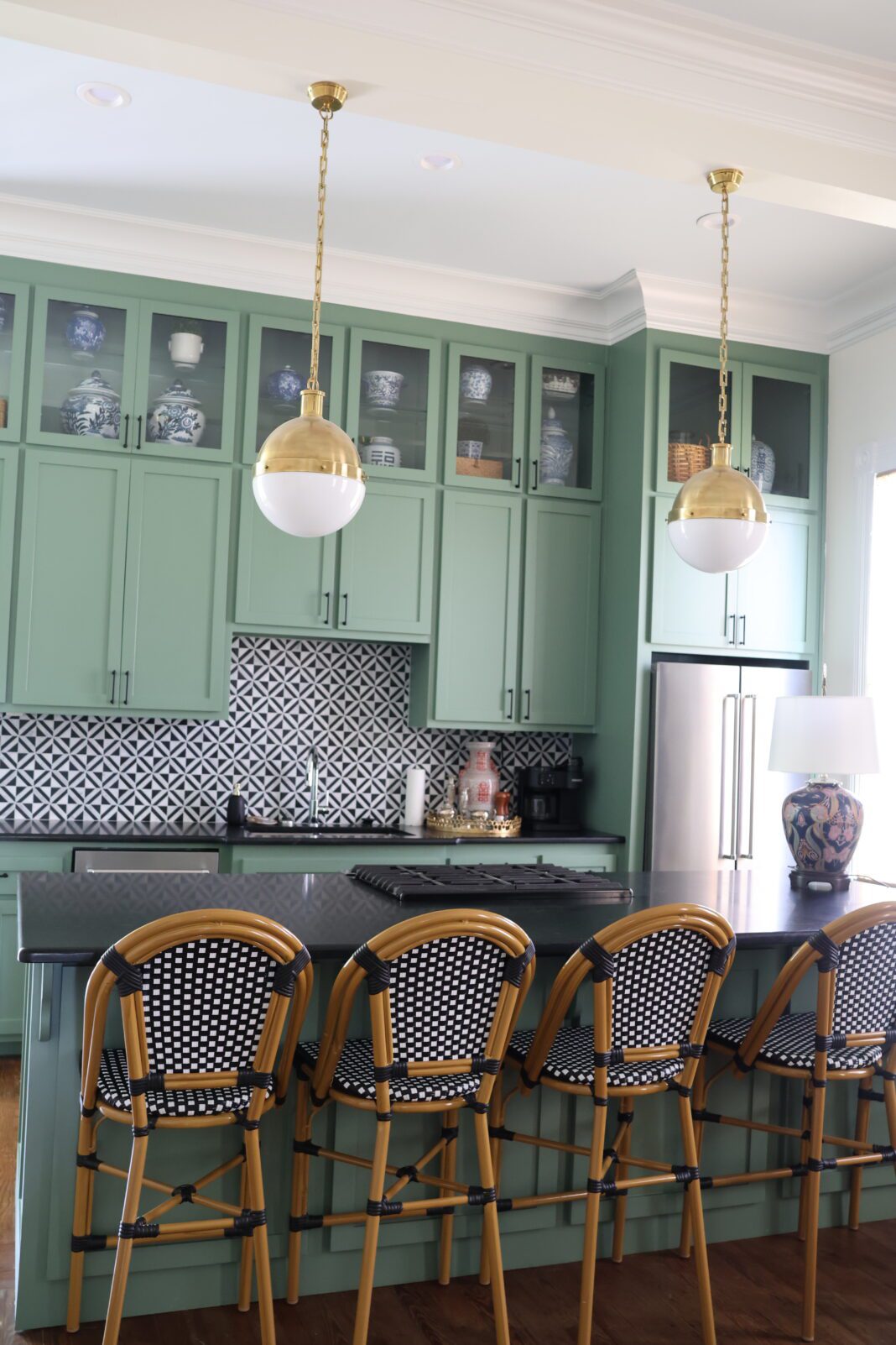 Through strategic color choices and plenty of natural light, the kitchen and dining room bring the outdoors in, harking back to the rural setting that lies just outside of the home’s doors. A sage green was chosen for the kitchen cabinetry, and large windows were outfitted with blue silk curtains. Over the dining table, the organic shape of a bubble chandelier mimics a cloud with the sun shining through.
