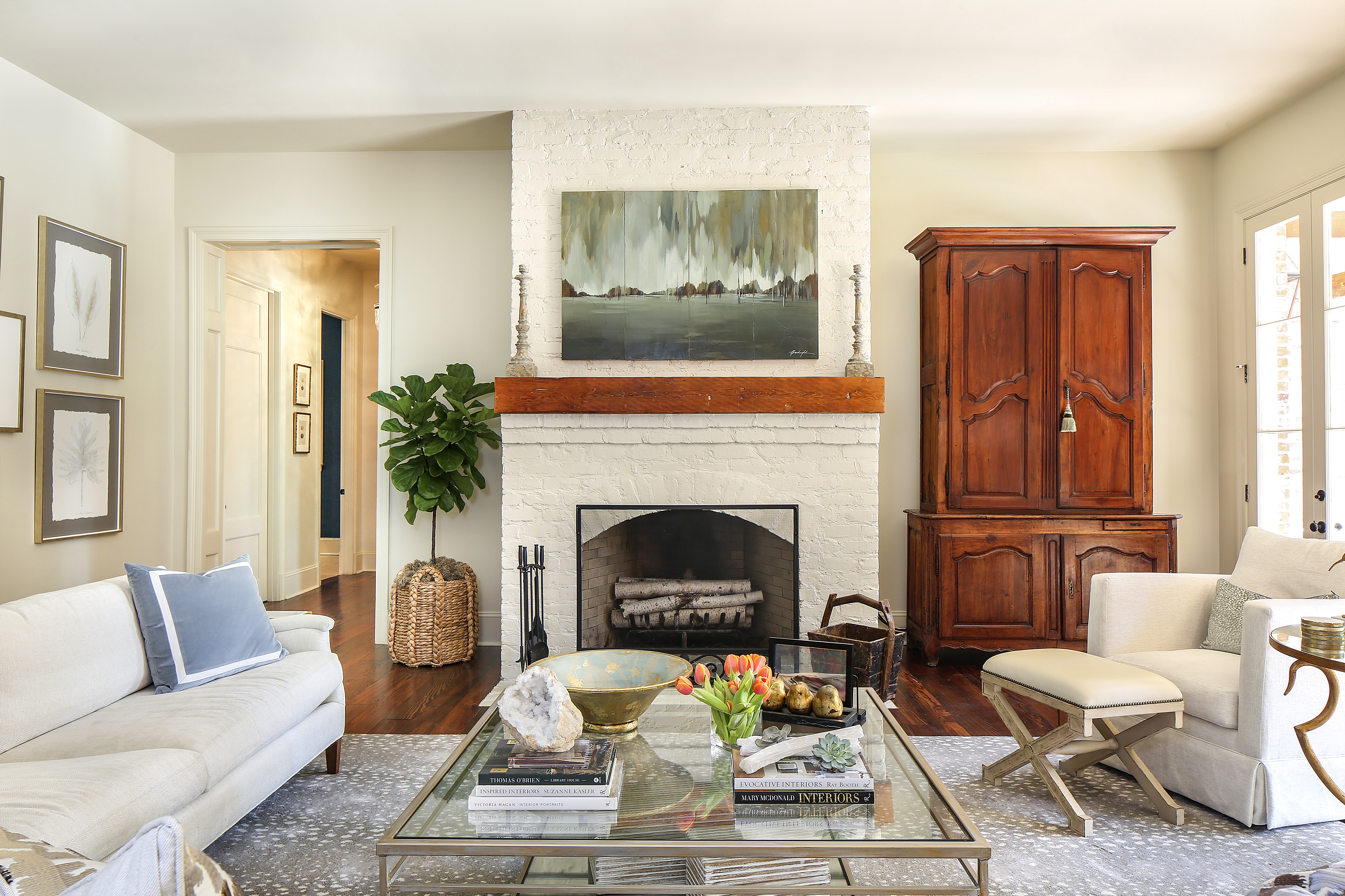 Back inside, the Uptons have relied on Anne McCanless to help them refresh their interior aesthetic, incorporating warm antiques and special pieces inherited from family members. “I’m a traditional person, but I have evolved,” says Mary. “I love more modern, abstract artwork and some other contemporary things, but still with that traditional feel. Anne has been here from the start and has helped our house evolve to what it is today. She helped us keep that traditional style while adding some edge to it with different pieces of art and lighting.”