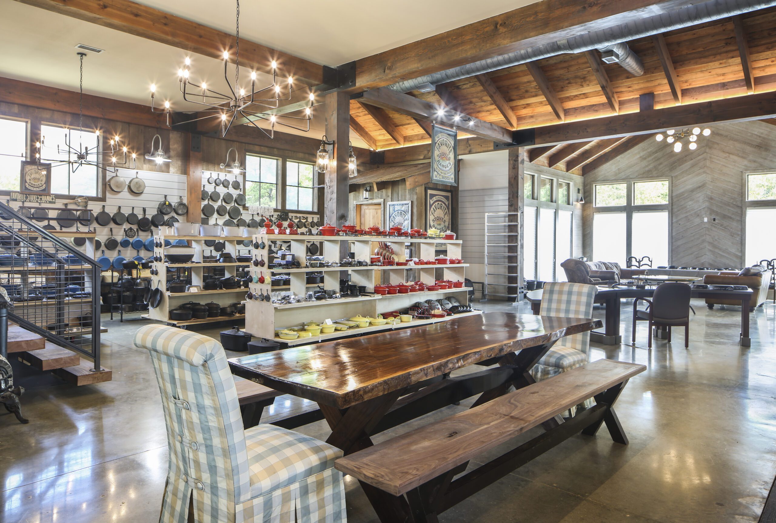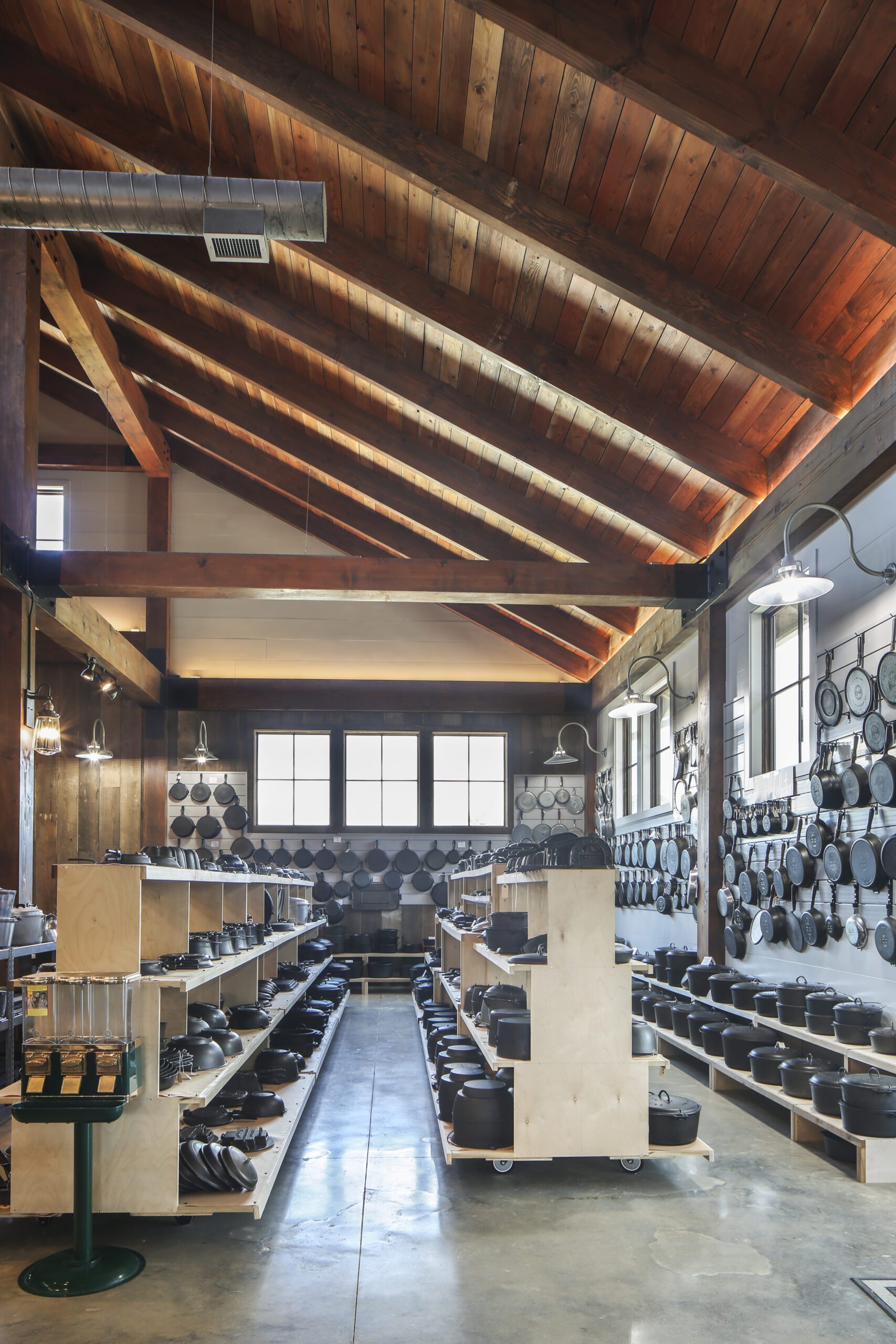 And yet the most memorable thing about homeowner Clayton Mitchell’s new temple for a decades-long hobby just might be the immaculate gleam. At certain hours of the early morning and late afternoon, curious window light pours in, cascading off the curves of the enamel and dark ore sheen of the 8,000 pieces of rare, vintage cast iron cookware—some of it dating back to the 1800s—he has meticulously researched, hunted and purchased. Blink and it looks like diamonds hanging in the air.