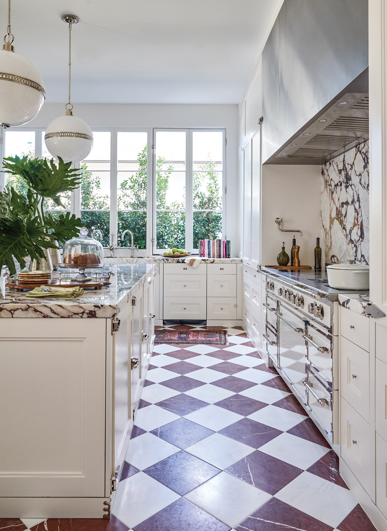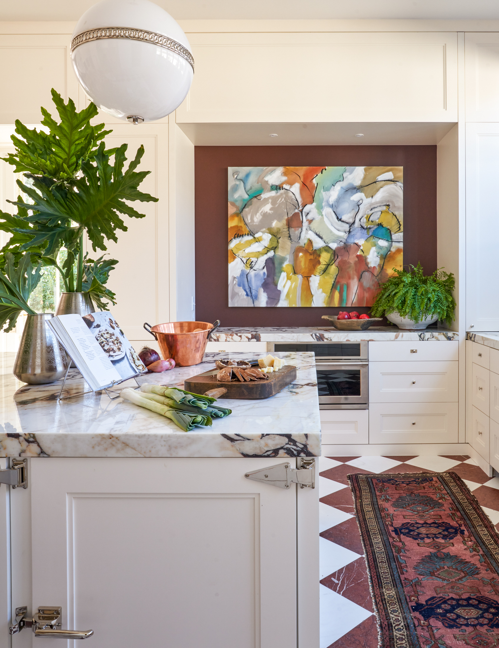What’s sizzling in this kitchen? Everything, from the brown and white marble tile floor to the heavily veined marble countertops to the brass-accented L’Atelier Paris range. Chad Graci collaborated with Jewel and Vincent Centanni on selecting the surfaces and hardware for this space and the adjoining breakfast area and butler’s pantry, and he completed the stunning scene with unforgettable details including a Cynthia Knapp painting from Ann Connelly Fine Art and a vintage runner in rich hues. “The concept was light and dark,” Graci says. “And there was so much hardscaping that I knew I needed to do something soft and inviting to sort of counteract all of the glossy, glitzy surfaces.”
