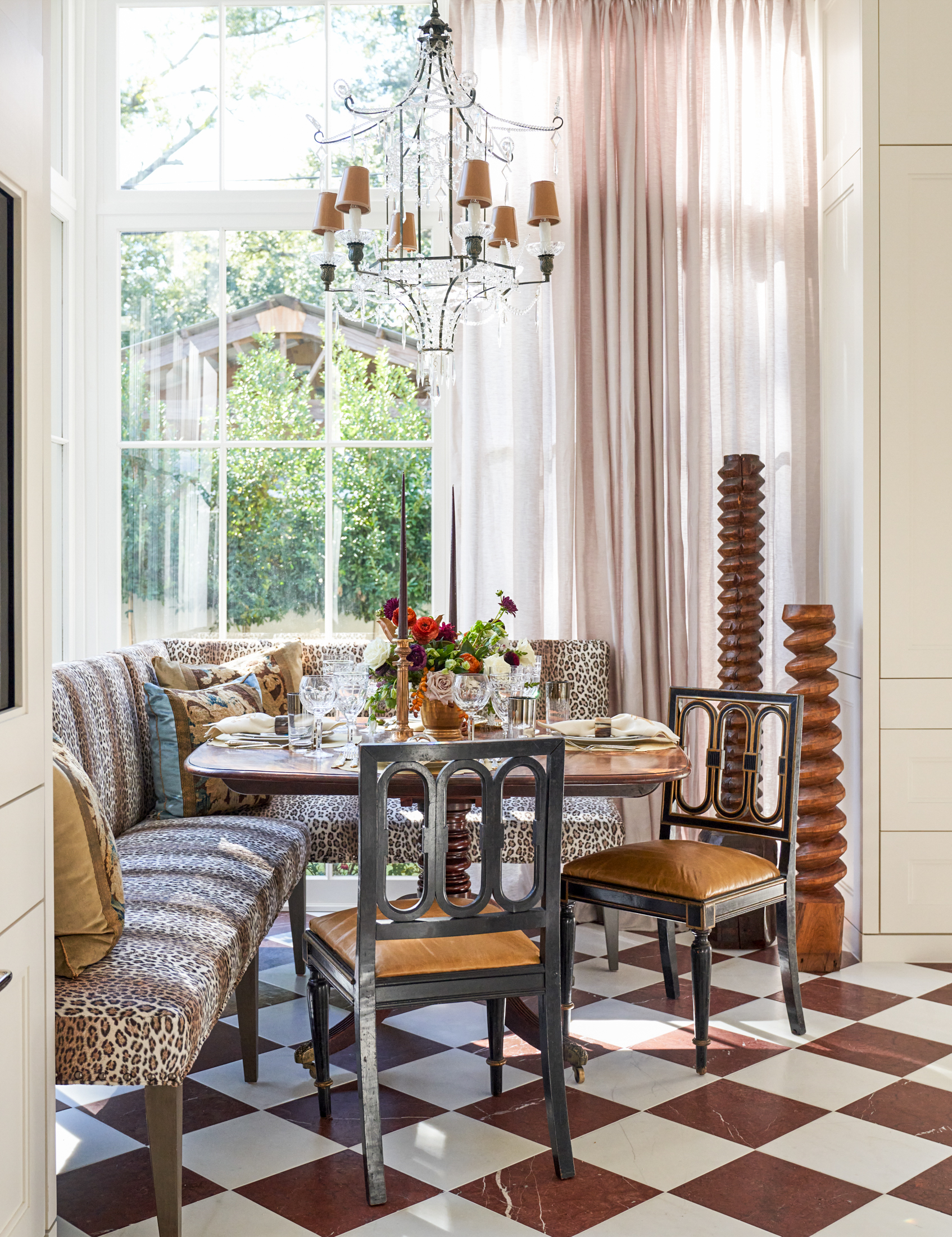 Graci chose a mahogany table for the corner breakfast nook and surrounded it with a leopard-print banquette topped with B. Viz Design pillows. The breakfast table is set with an arrangement of dahlias, zinnias and hydrangeas by Michelle West Design Studio, along with napkins and placemats from Leontine Linens. Overhead, this area’s finishing touch is a pagoda-style chandelier from Fireside Antiques. “I was looking, looking, looking for the right thing, and I didn’t want it to be a typical kitchen fixture with a big cloche or a shade or something,” Graci says. “I wanted it to be crystal, and this is what we ended up with—this gorgeous pagoda.”
