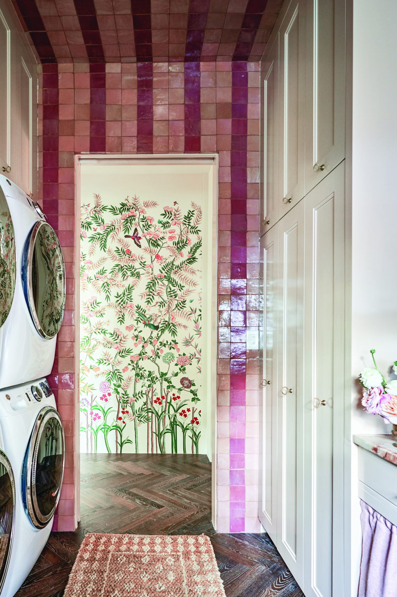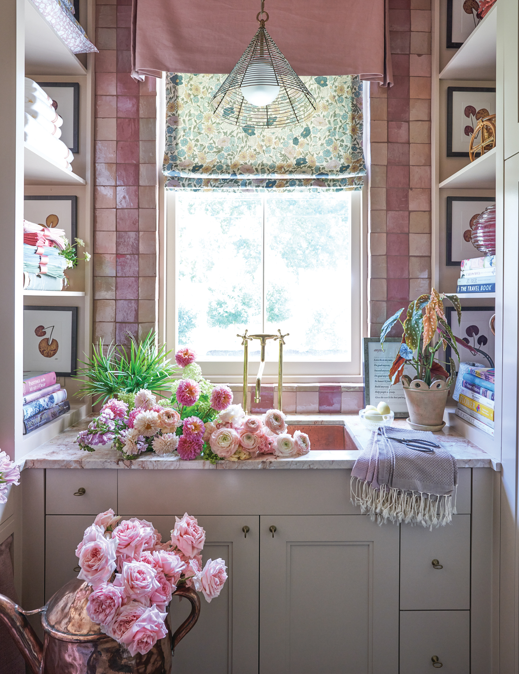 Wash day becomes a wow moment in this laundry room, which features a dramatic ribbon of pink tiles that extends from one end of the room to the ceiling to the other end. That rose-colored tile design, created by Jewel Centanni, served as inspiration for Amanda Smith Fowler’s design details, including a Liberty London floral fabric for the window shade. Just outside the room, Fowler placed an overscale floral wallpaper from Liberty London that gives the feeling of being immersed in a garden setting. AnnMarie Meyers of Hummingbird Floral Studio massed pink roses in a copper watering can and more flowers in the sink to complete the floral fantasy.