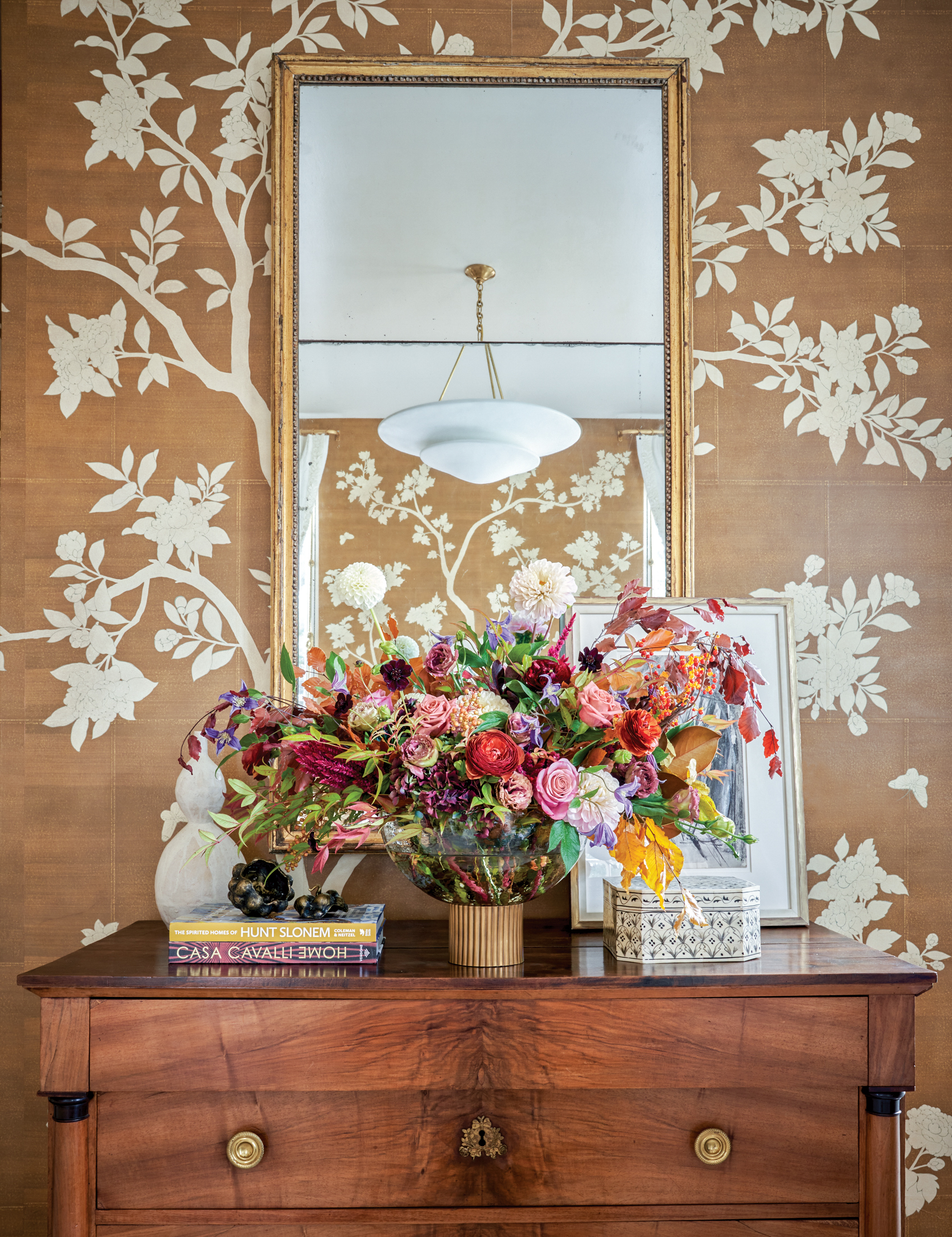 Dainty floral elements abound in this bedroom suite that draws inspiration from the Gracie Studio wallpaper that envelops it. Lisa Palmer planned this space as one where tiny touches of beauty are hidden all around—on the embroidered headboard, on the delicate curtain trim, and within the commissioned Cathy Hegman painting that graces one wall. The firmly rooted focus extends beyond the corner room’s windows to the old live oak tree just beyond. Palmer also plucked the ruby hue in the lamps that flank the bed from nature; Pick-a-Petal Floral Design’s Emily Eberwine used the same color in her arrangements of clematis, cosmos, dahlias, roses and nandina. Across from the bed, Palmer placed a chest from Fireside Antiques.