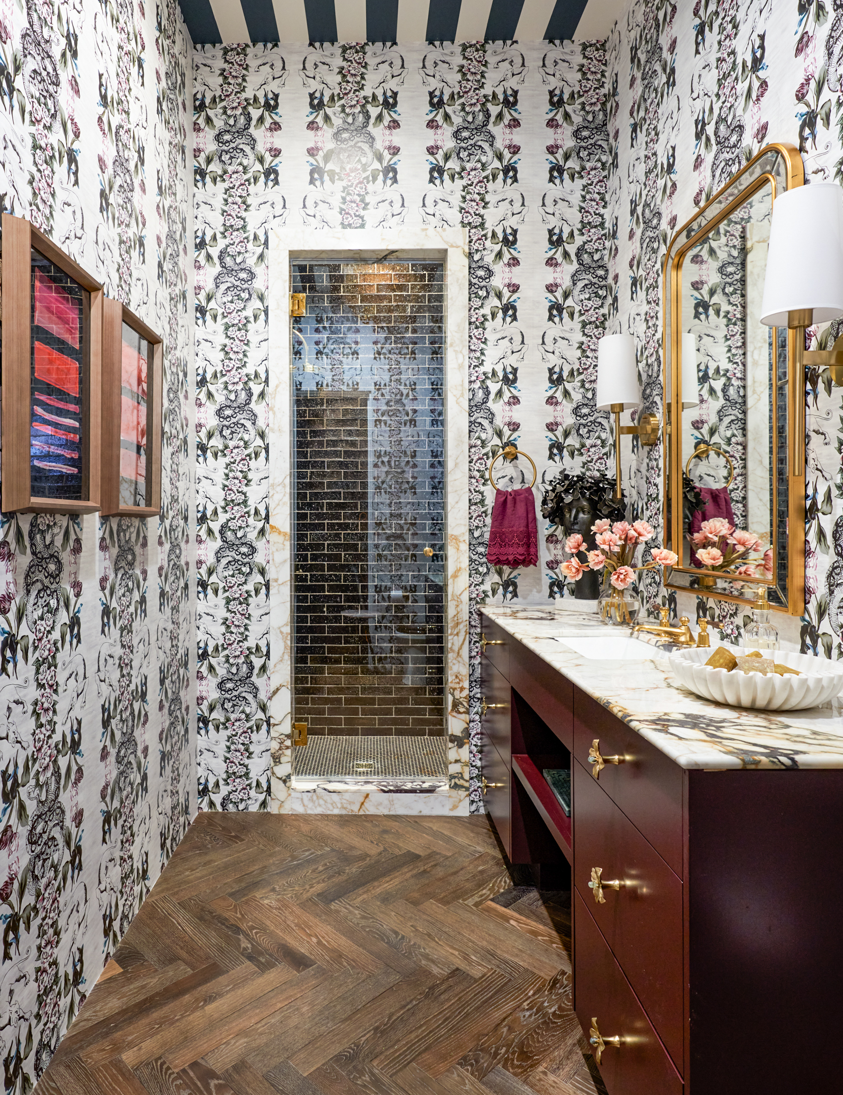 The creature feature continues in the adjoining bathroom, where Solomon installed Fabricut wallpaper featuring snakes and insects. Bold stripes on the ceiling play off the herringbone-patterned floor below and are echoed by multimedia artworks that hang opposite the gilded mirror.