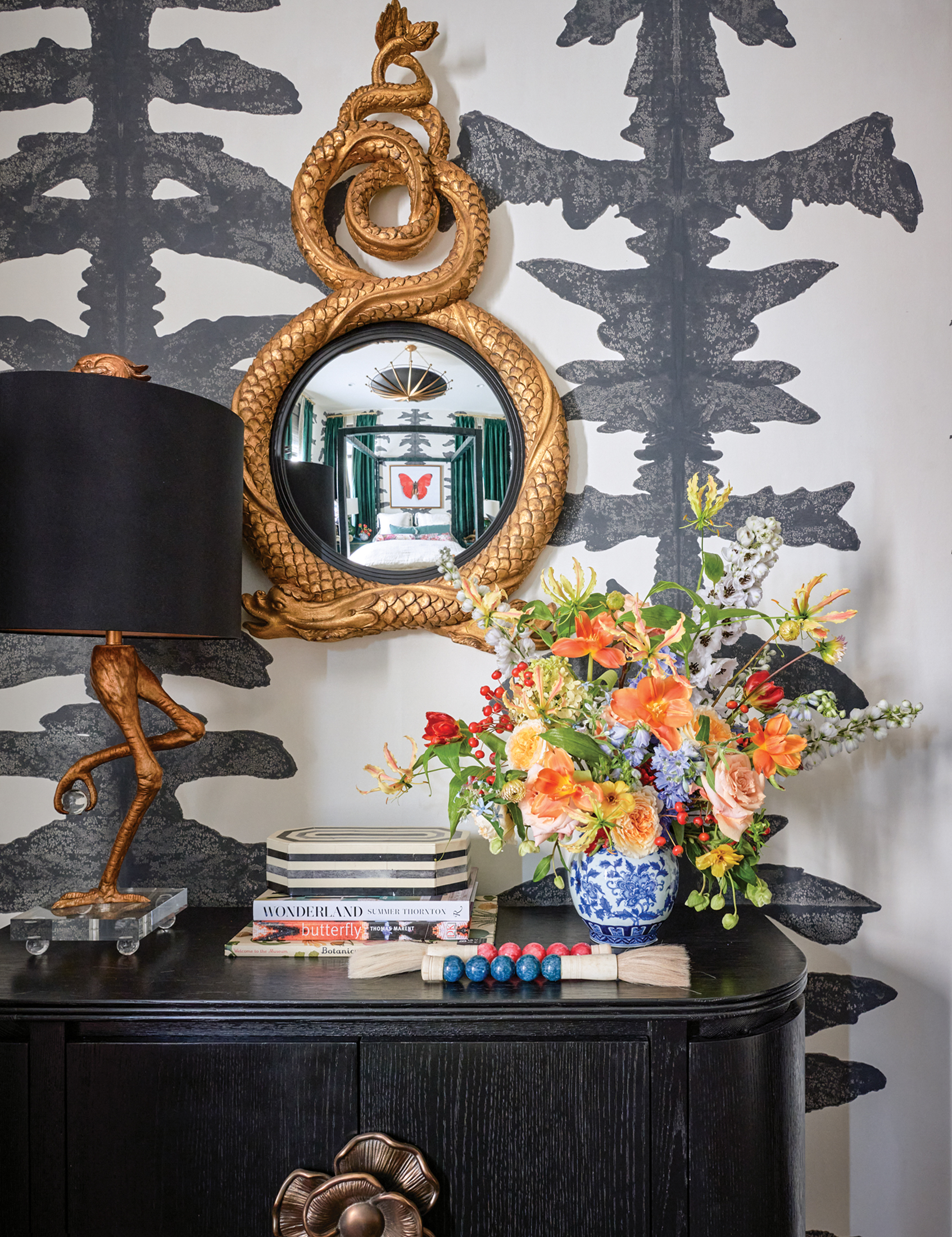 From flora to fauna, Veronica Solomon let her imagination take flight in this bedroom suite. Inspired by the butterfly-like inkspots on the Porter Teleo wallpaper, Solomon incorporated the colorful winged creatures into the room’s art, the Alexander McQueen rug, and even the furniture hardware. But she didn’t stop with butterflies; other living beings represented here include snakes on the gilded mirror and a crocodile motif on the four-poster bed. Atop a Currey & Company black dresser, AnnMarie Meyers of Hummingbird Floral Studio created a colorful arrangement inside a blue and white vessel.