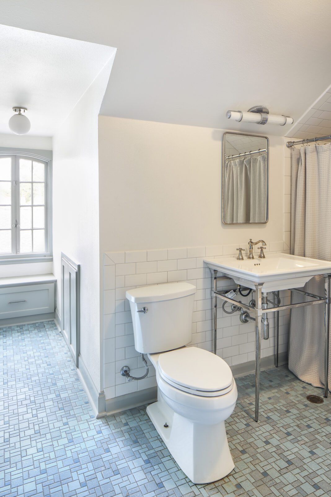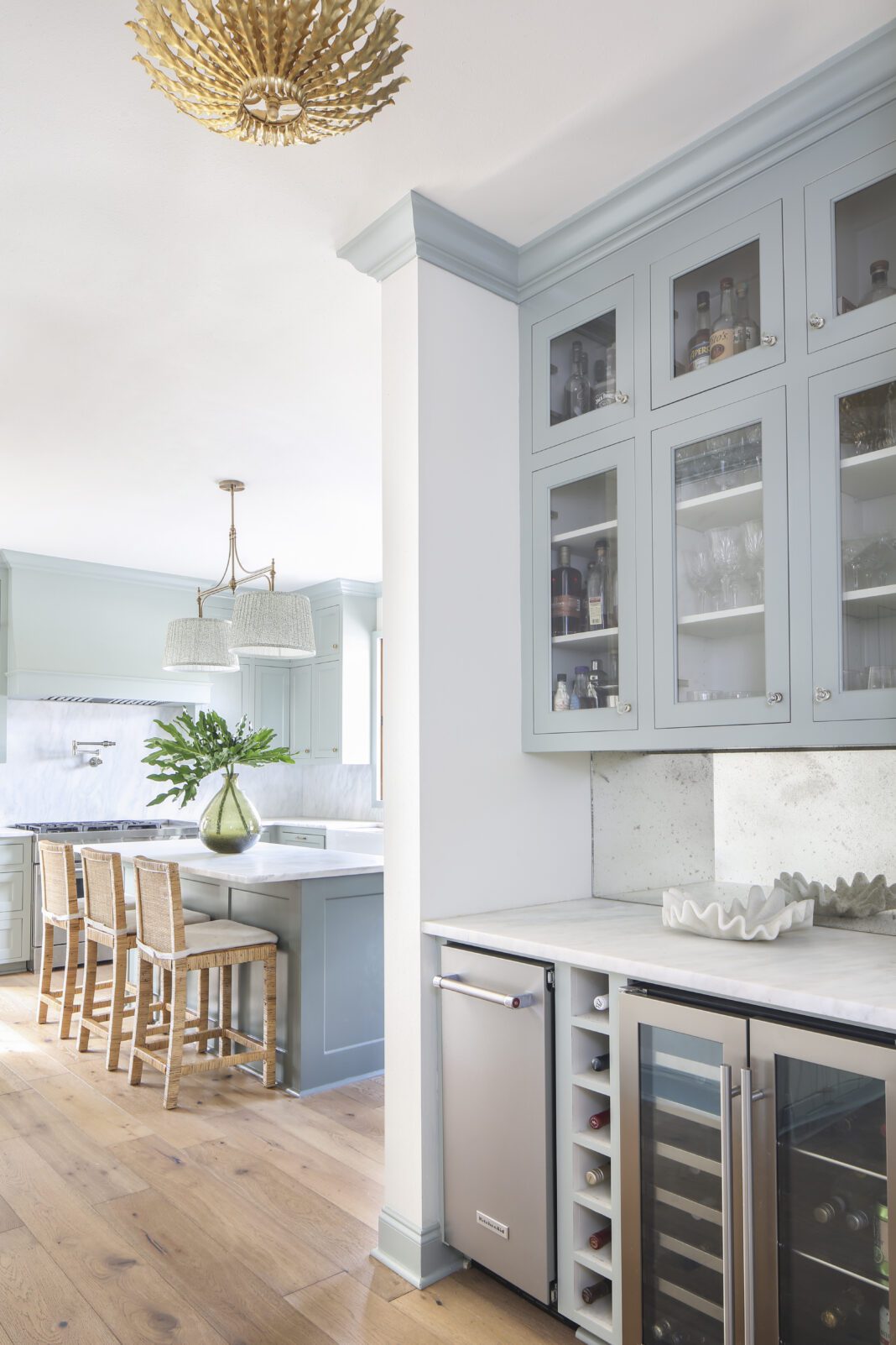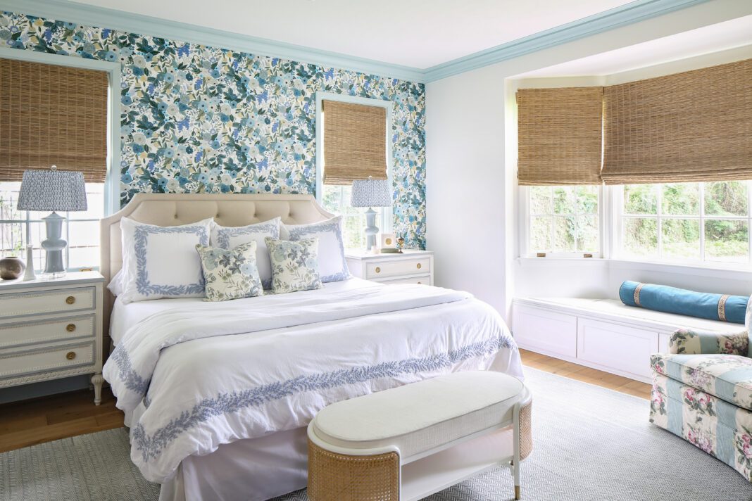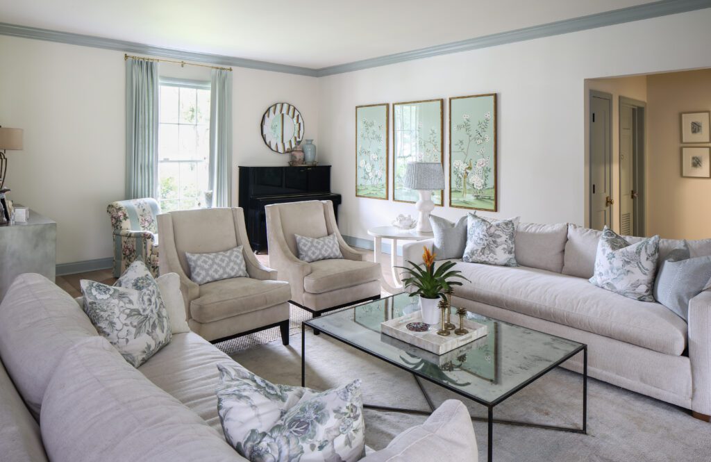 With Sara’s guidance, the mural in the dining room became the inspiration for the color palette throughout the house, its by-the-sea shades translated into paint colors used on cabinets, molding and trim in several rooms. The designer also sourced light fixtures that fit with the home’s style without being too period-specific, and she created “layers of interest” with new textiles and thoughtful placement of furnishings.