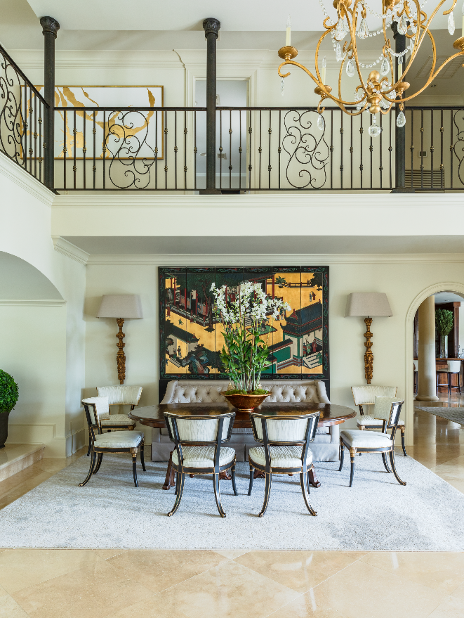“The scale in this house had to be considered in every room,” says Miller. “The ceiling of the living room is 22 feet tall, so the mirrors on either side of the fireplace were custom made to be 8 feet tall just to make the room feel right proportionately. And in large-scale rooms, I use fewer pieces that are larger in size. The result makes the space inviting, but not cold.”