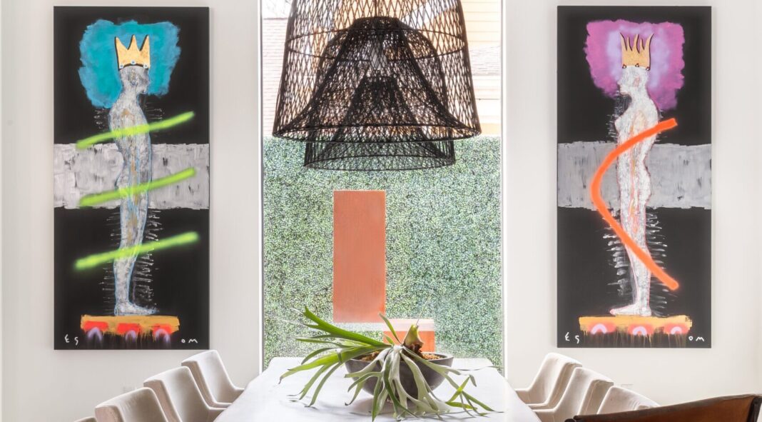 Louisiana artists are represented throughout the house, from a pair of Tony Mose paintings and a work by Robert Rector in the informal open dining area to a two-panel alligator gyotaku work by Leslie Charleville just off the living room. But they also selected artworks from artists around the world, including Turkey’s Adviye Bal, who created the multi-figure painting displayed in the living room. And because they are big on sightlines to the outdoors as well as what’s inside, they found an artist on Etsy to create a custom steel sculpture for a spot just outside a tall window in the informal dining space. “I liked the geometric instability of it,” Prescott says.