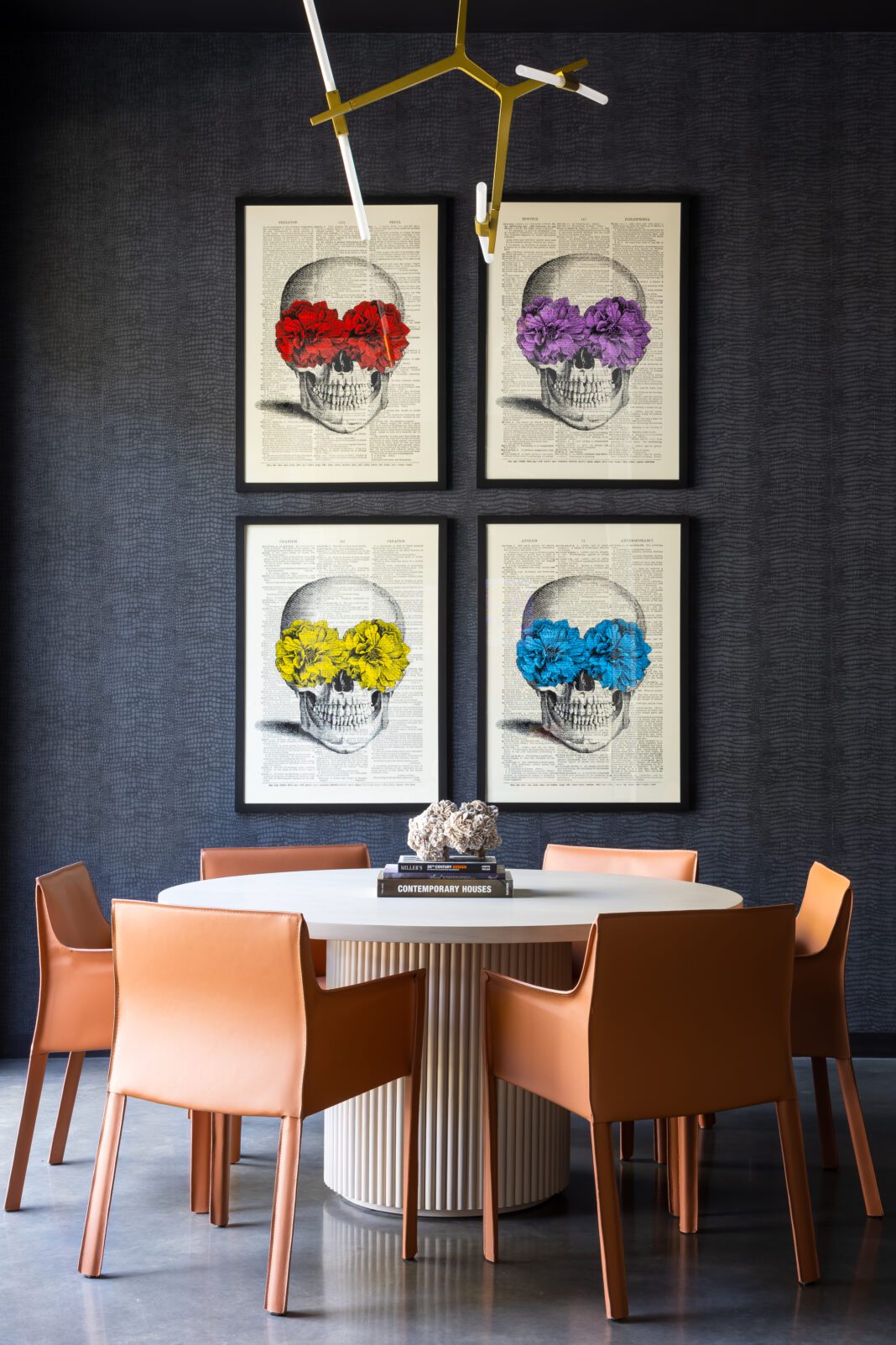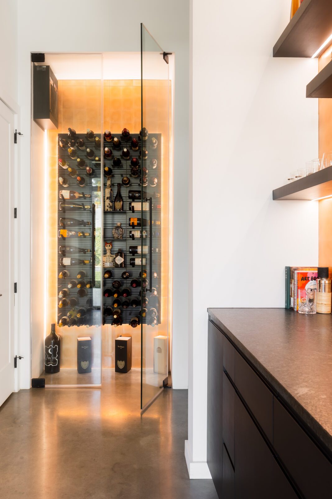 Still, this house is minimalistic—“We’re low on clutter” is how Prescott puts it—but not sparse. That gives the pieces that do fill these rooms special significance, and the couple was keen on customizing every element that they could. A pair of pendant light fixtures over the informal dining table, for example, was repainted from white to black to complement the adjacent black-centric kitchen. Over the kitchen island, a single fixture of hanging cylindrical pendants was separated so that each little light could shine over a larger area. And a custom climate-controlled wine room was tucked into a corner behind the kitchen and next to a copper-tile-adorned bar area.