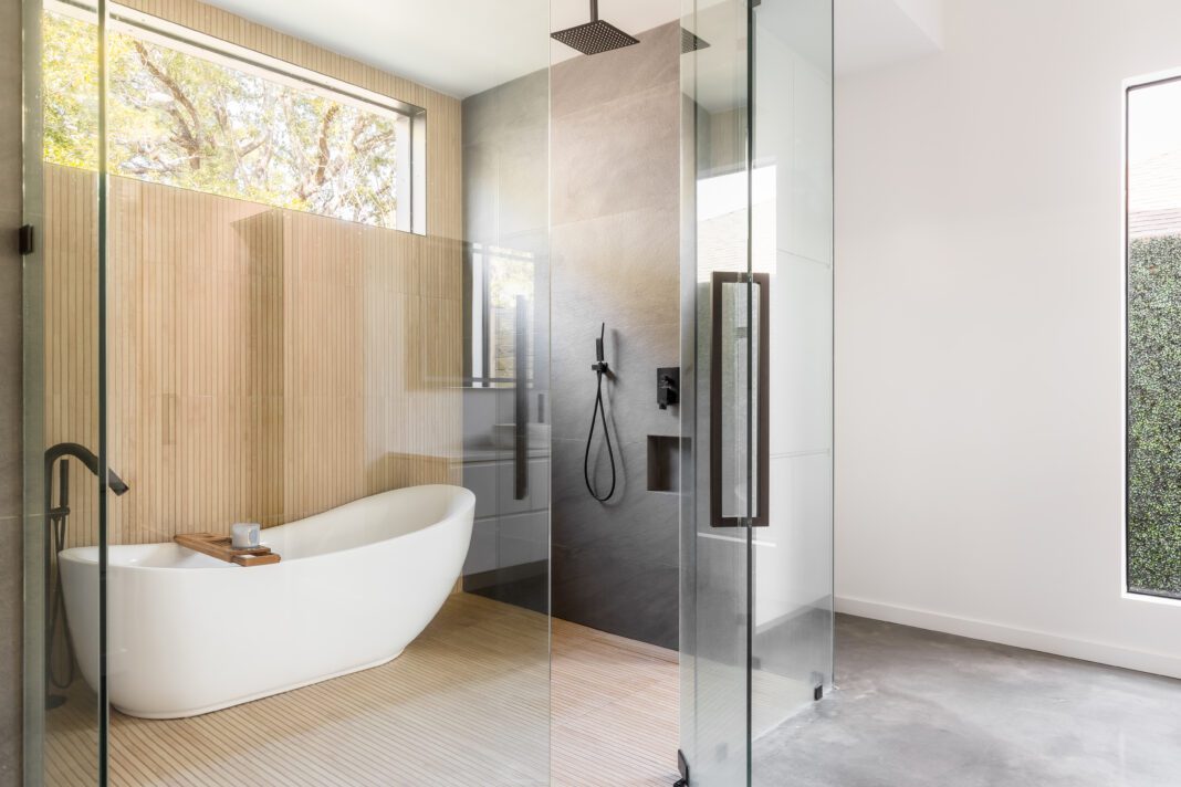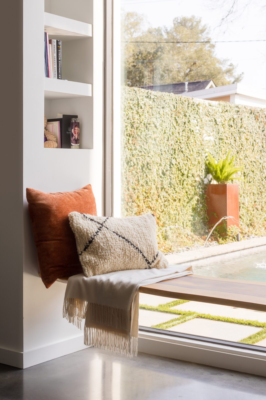 Windows are another key part of the artistry here, and Prescott intentionally had them placed where they maximized views of the natural environment. A massive picture window in the primary bedroom perfectly frames the Bill Reich-designed rear landscape. Because of the alignment of the en suite bathroom with that bedroom, it’s also easy to see out back while soaking in the tub, and at the same time, one need only look up from there to see the tops of the live oak trees out front through a steel-cased high horizontal window.