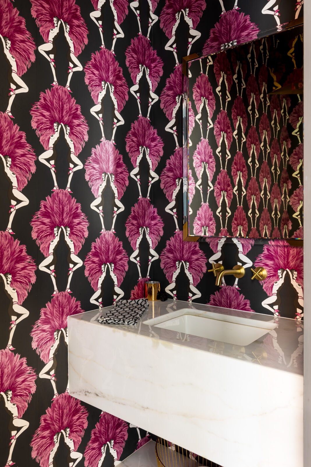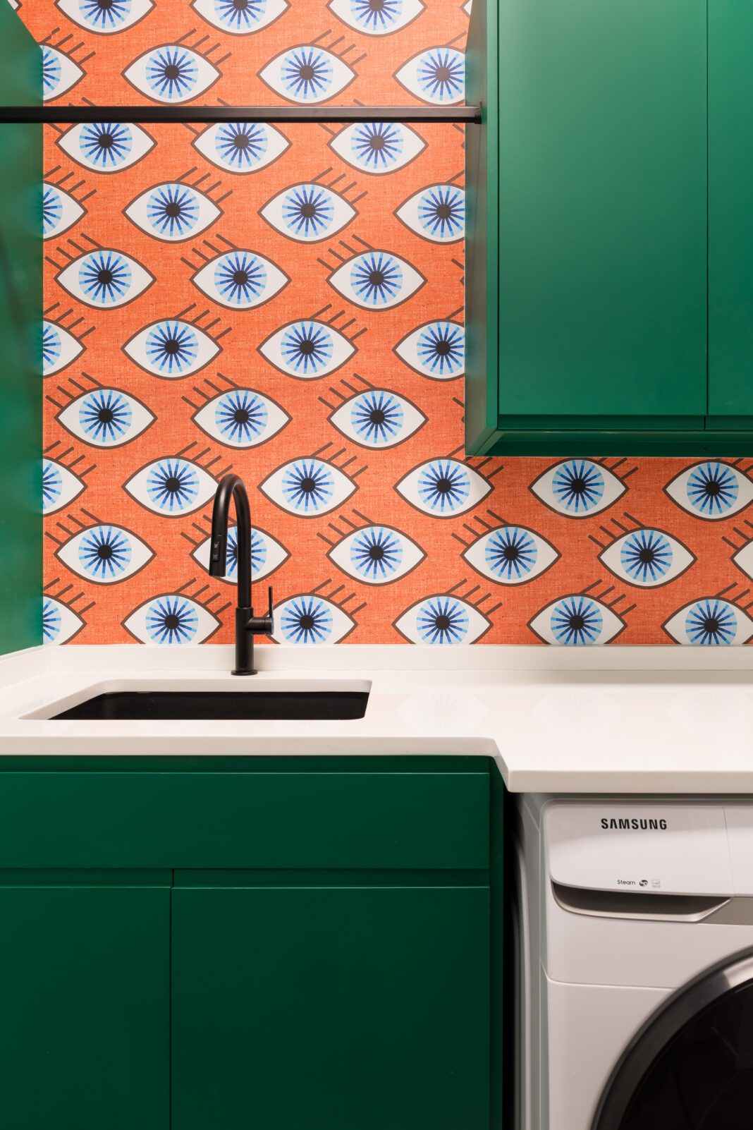 Bold color is integral to nearly every room, in many instances through the use of statement-making accent walls in contrasting hues. In other spaces, wallpaper with large-scale patterns does the talking. And in some spots—like the laundry room with its grassy green cabinets and eye-catching wallcovering—both color and pattern are on full display.