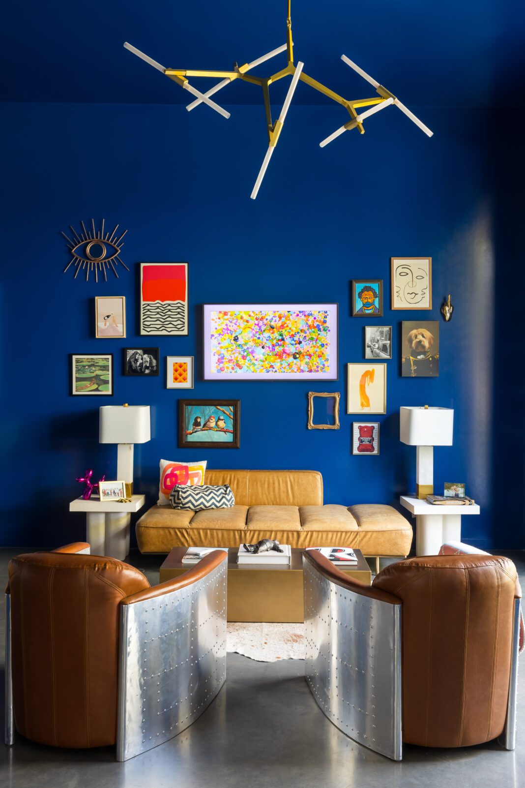 Baby daughter Blake’s nursery is a second-story sweet spot with an abstract art-inspired accent wall behind the crib. The second floor is also home to an additional bedroom and living space, but the modular sectional sofa in the living room is a favorite spot for the whole family—including a 6-year-old miniature goldendoodle named Larry—to hang out. Even the home office, where Prescott often works at his built-in standing desk when he’s not at his office, is welcoming to the whole crew, with its leather lounging sofa and aviator chairs surrounded by bright blue walls and whimsical art (including a piece that portrays Larry as a military general). “This is where we put the fun art,” Prescott says.