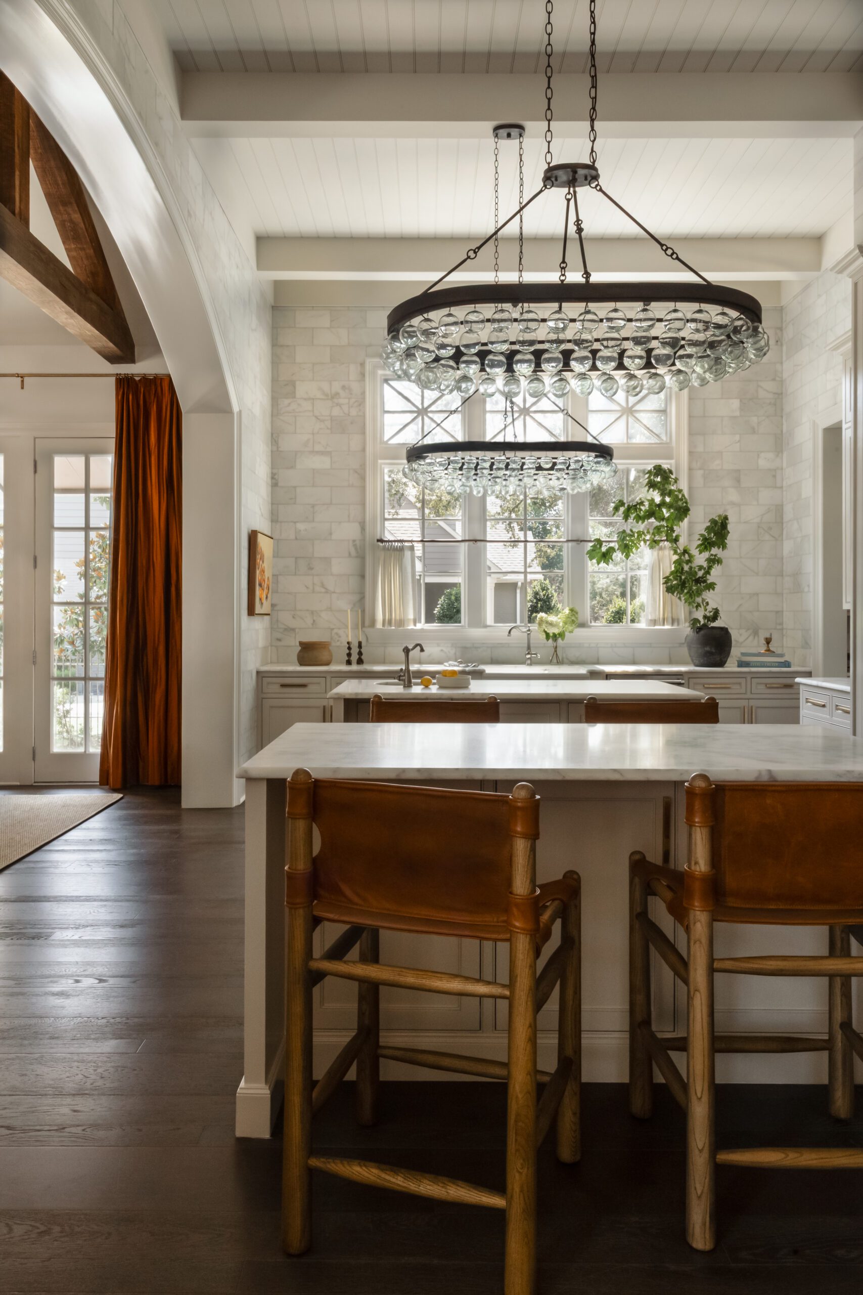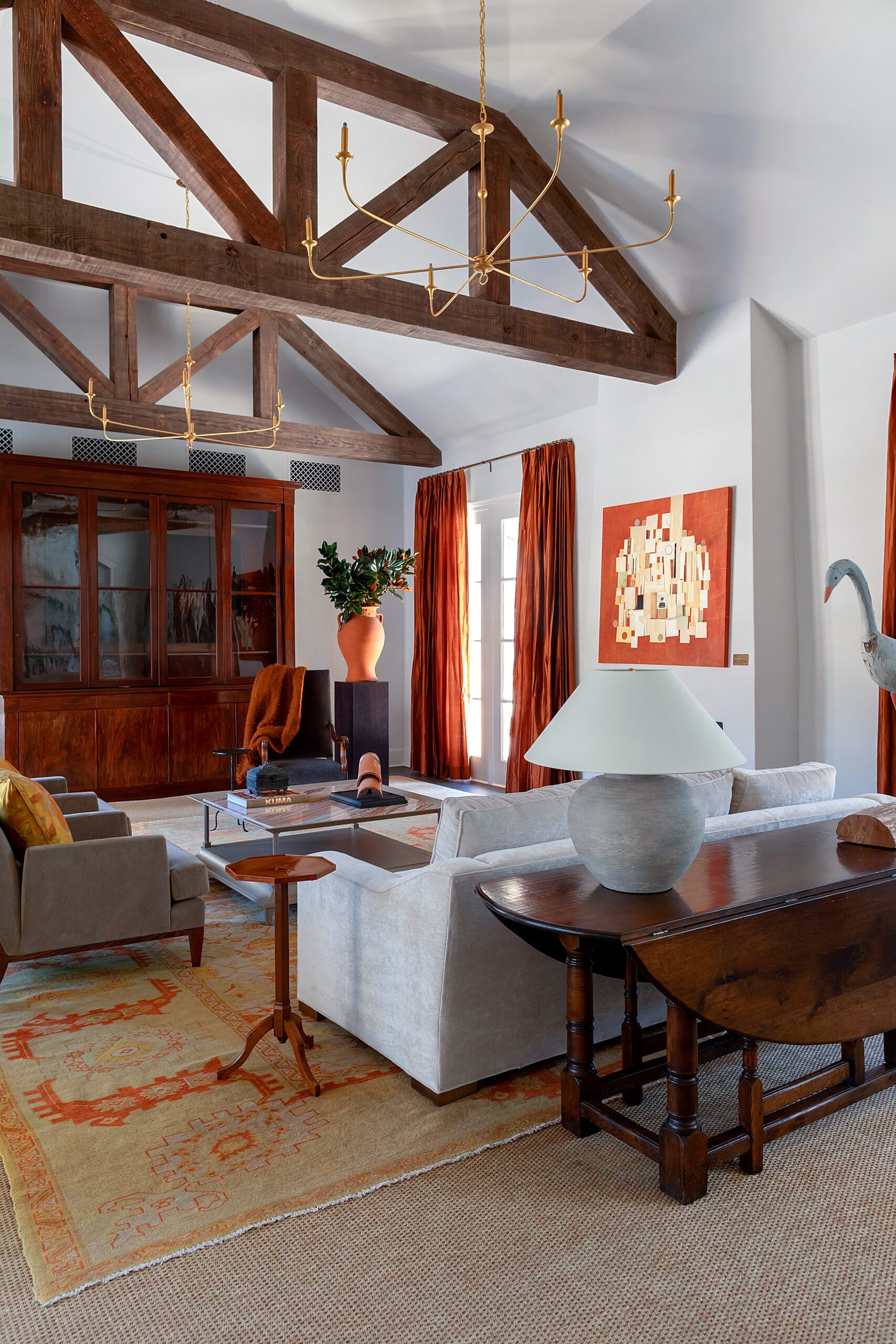 Beyond the kitchen, which required only minimal renovation, the large-scale family room is another key area for entertaining. Here, Brown was inspired by the color of the terracotta roof tiles atop campus buildings. “The Olmsted brothers, inspired by San Giorgio dei Greci in Venice, Italy, wanted to bring the Italian Renaissance to the Bayou State,” reads a plaque that sits on a table beside an example of those tiles. “The rich terracotta roofs have glistened in the southern Louisiana sun since 1926.”