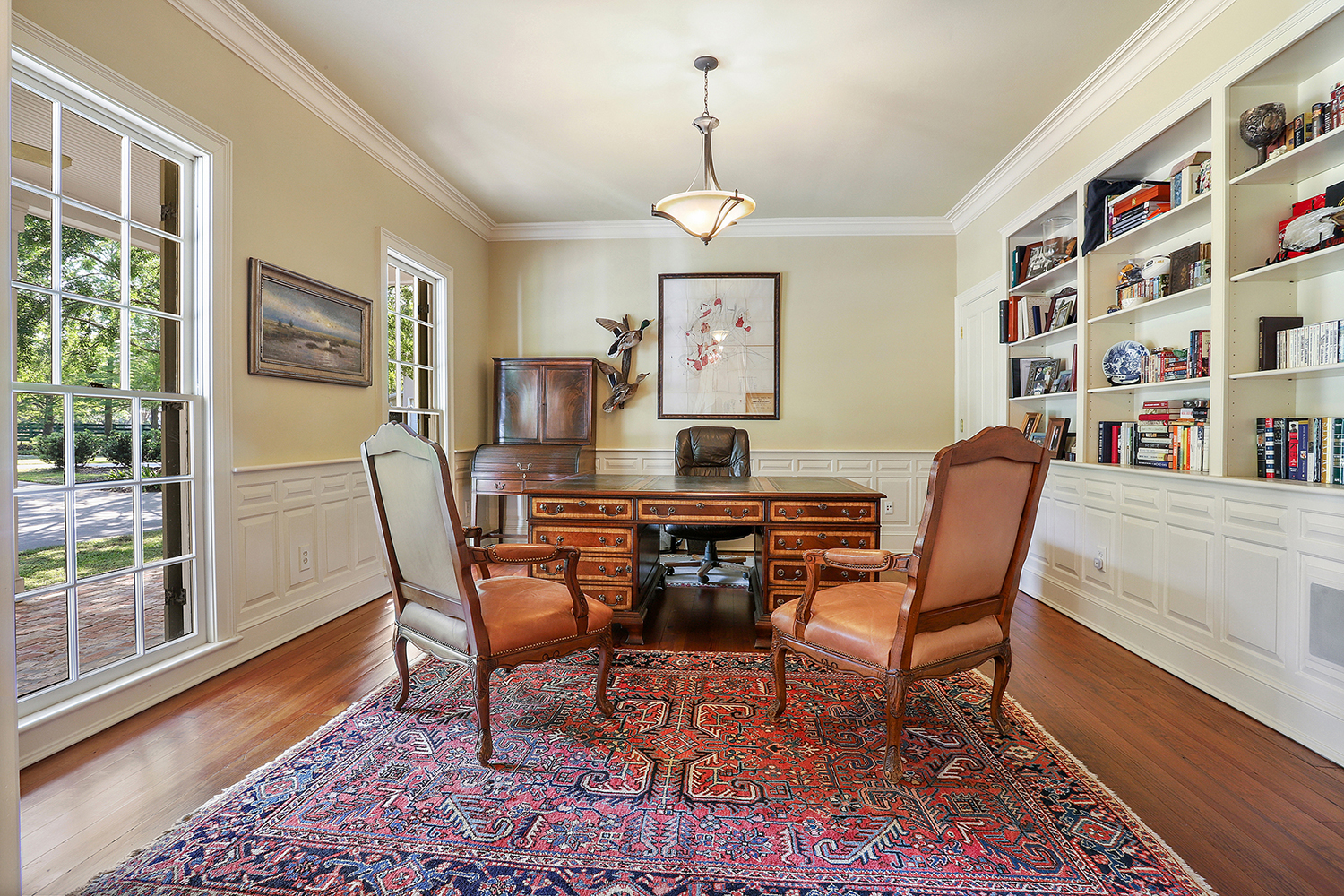 Within the Walls: Wood detailing and warm colors lend a welcoming feel to this centrally located abode. Key features include a gourmet kitchen with butler’s pantry, an office with built-in bookshelves, and a large multipurpose space. Expansive windows bring in the natural light and showcase views of the outdoor spaces.