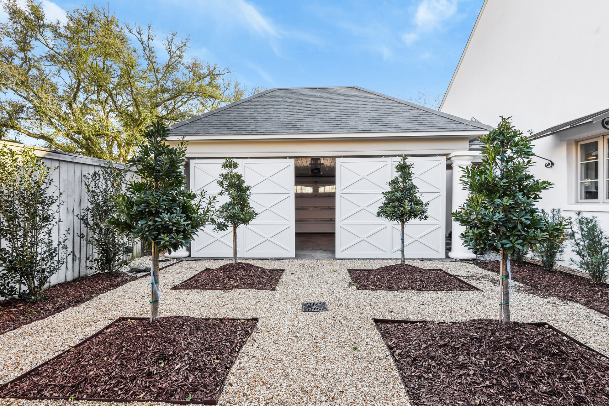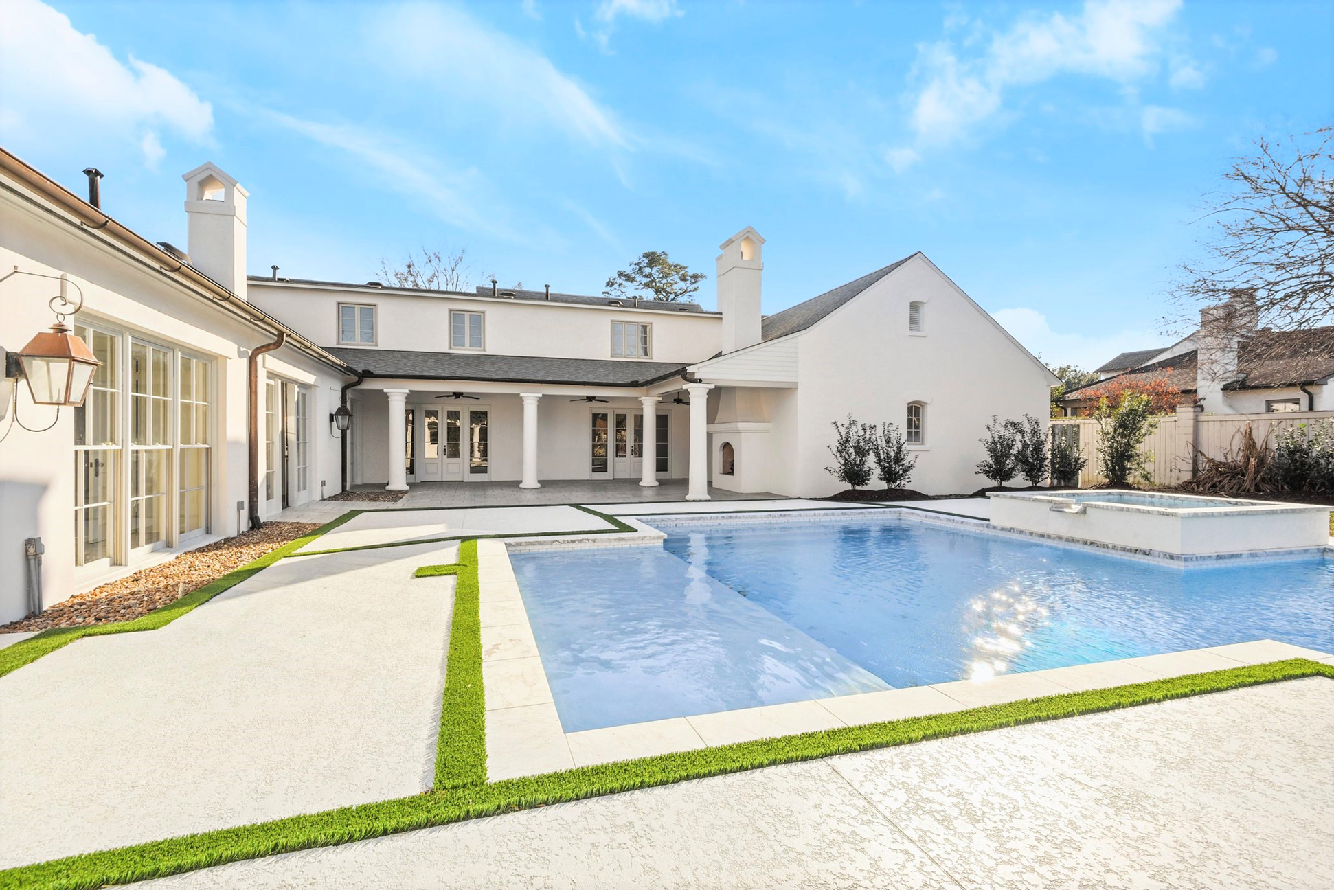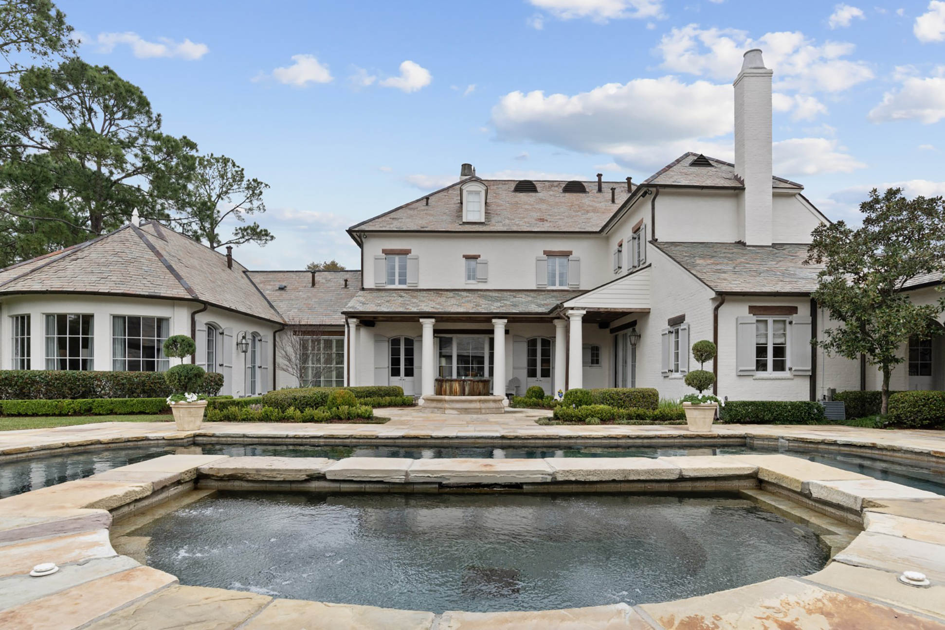 Lay of the Land: The covered outdoor kitchen includes a seating area, pizza oven, deep fryer and multiple refrigerators. In case of rain, there’s an additional enclosed kitchen with bar seating and large windows overlooking the pool. Other outdoor features include a fireplace, hot tub, large oaks in the front yard and a covered walkway to the three-car garage. The manicured hedges and trees add to the elevated French style.