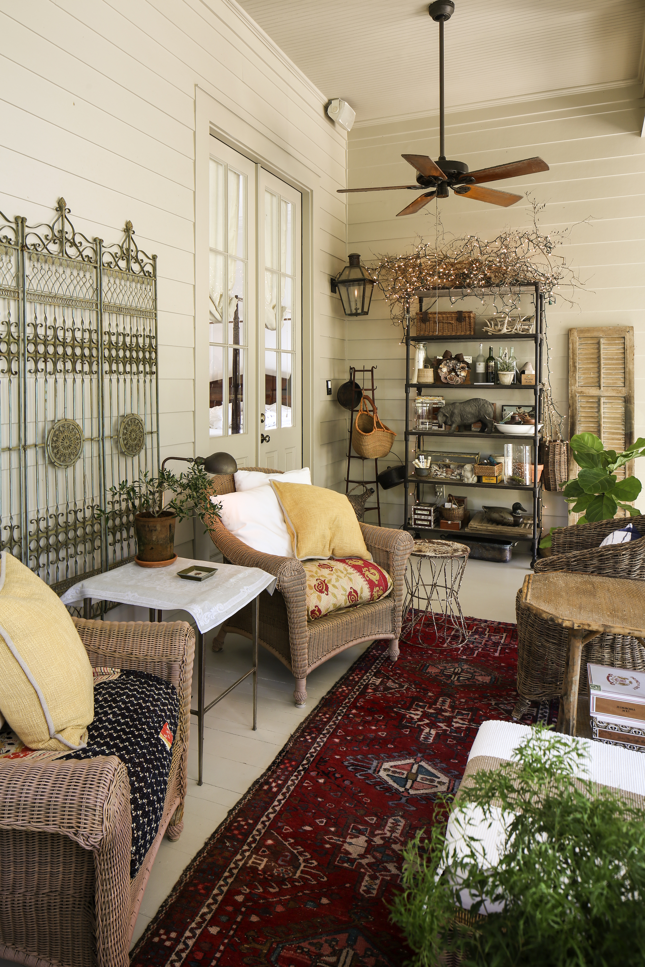 Suspended from the beadboard ceiling, an oversized hammered brass domed pendant fixture gives an unexpectedly glam touch to this back porch. Design by Shannon Barksdale Mahon. Photo by Melissa Oivanki.