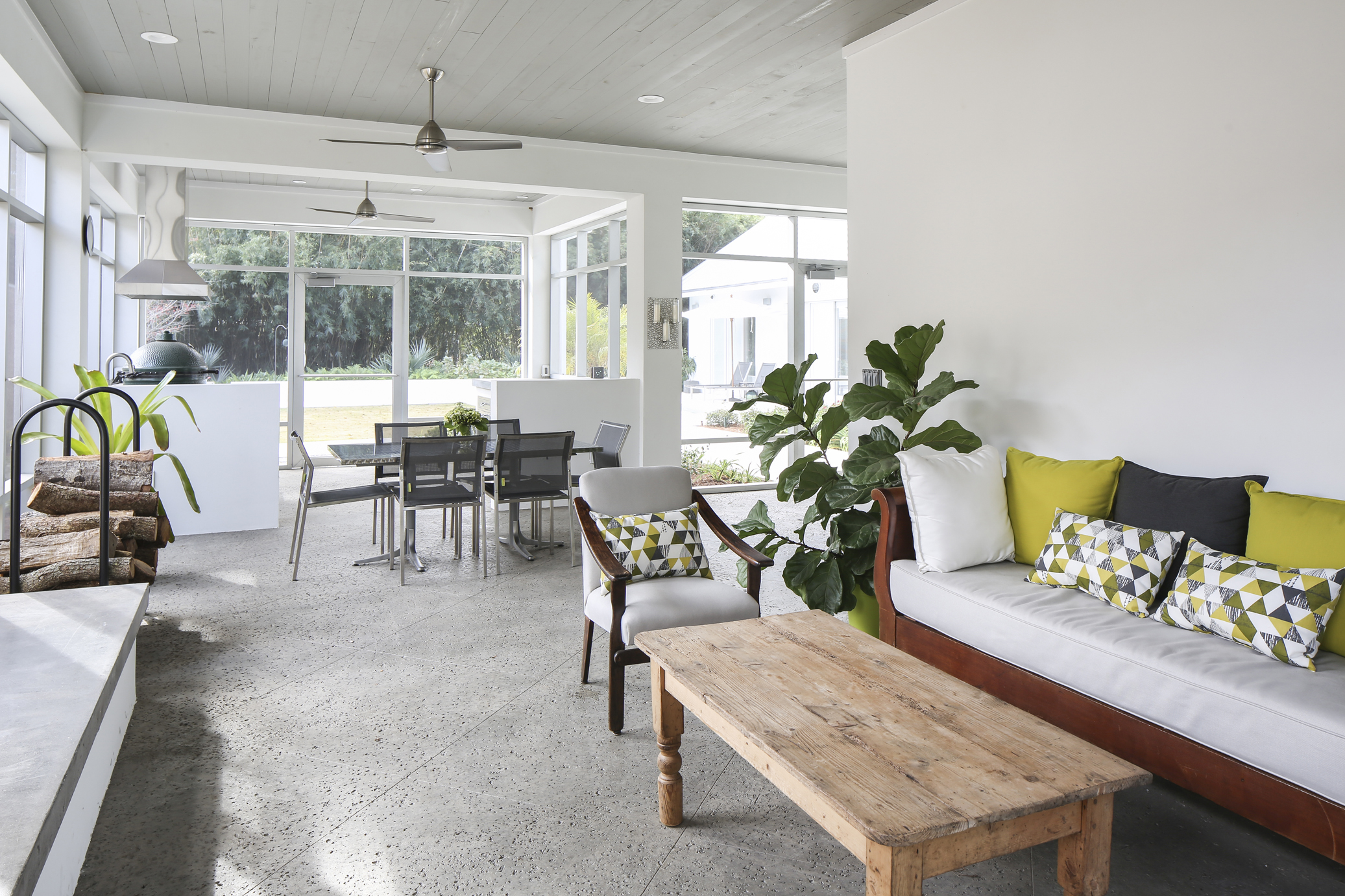 This living room opens up directly to a screened-in porch with accordion doors. In good weather, the homeowners use the outdoor kitchen and seating area to entertain, and the outdoor fireplace is often used by the grandkids for roasting marshmallows. Photo by Melissa Oivanki.