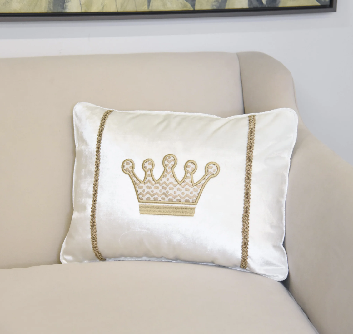 The pillows cost $335 each and come in two varieties: an Antique Gold appliquéd crown with Antique Gold trim, or the Gold appliquéd crown with Gold trim.