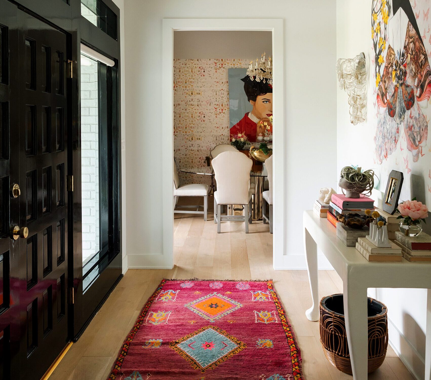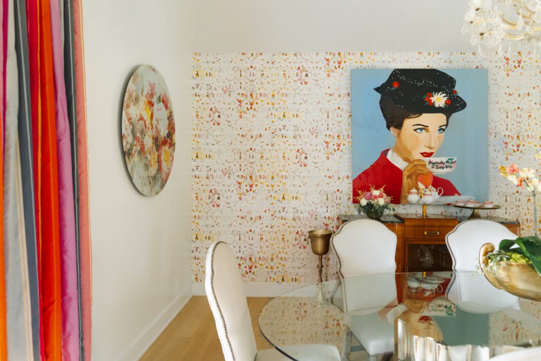 The Roberts came into this house with a few cherished pieces of art, but they also found several more during the renovation process. Many of the pieces they selected came from Ann Connelly Fine Art, including a custom Demond Matsuo painting of a geisha that hangs in the front entryway and the Jacqueline Dee Parker collage in the dining room.