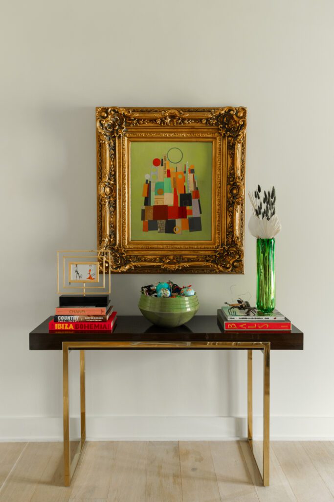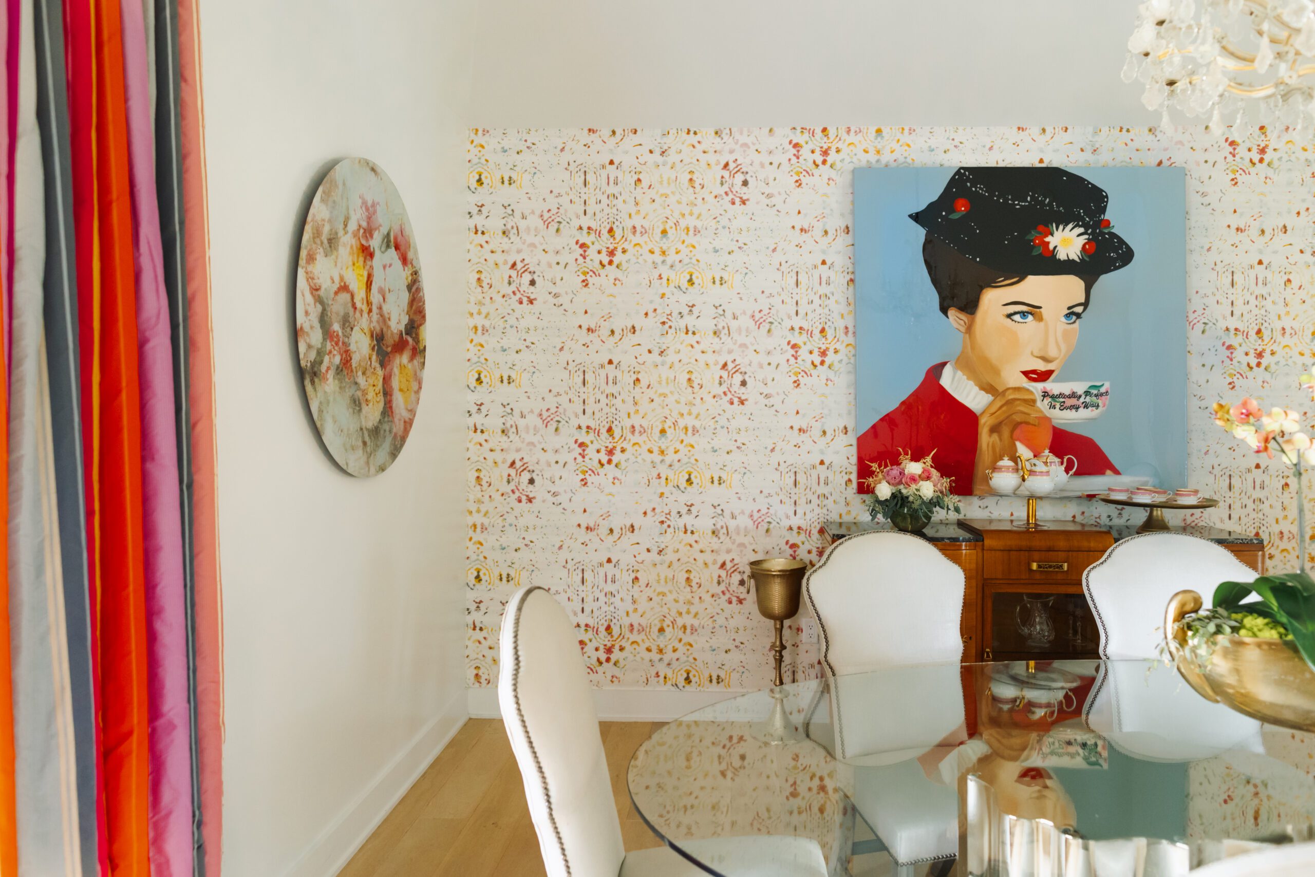 Though it isn’t the biggest piece of art in the house, you might say Kristi and Taylor’s Jacqueline Dee Parker piece now represents them best. Hanging on a wall in their dining room, even the way the collage is displayed reflects its owners’ irreverent approach to design. Instead of selecting a sleek, minimalistic frame, the couple tucked the artwork inside an ornate, Baroque-influenced gilded frame that once hung in Taylor’s childhood home. Old meets new.