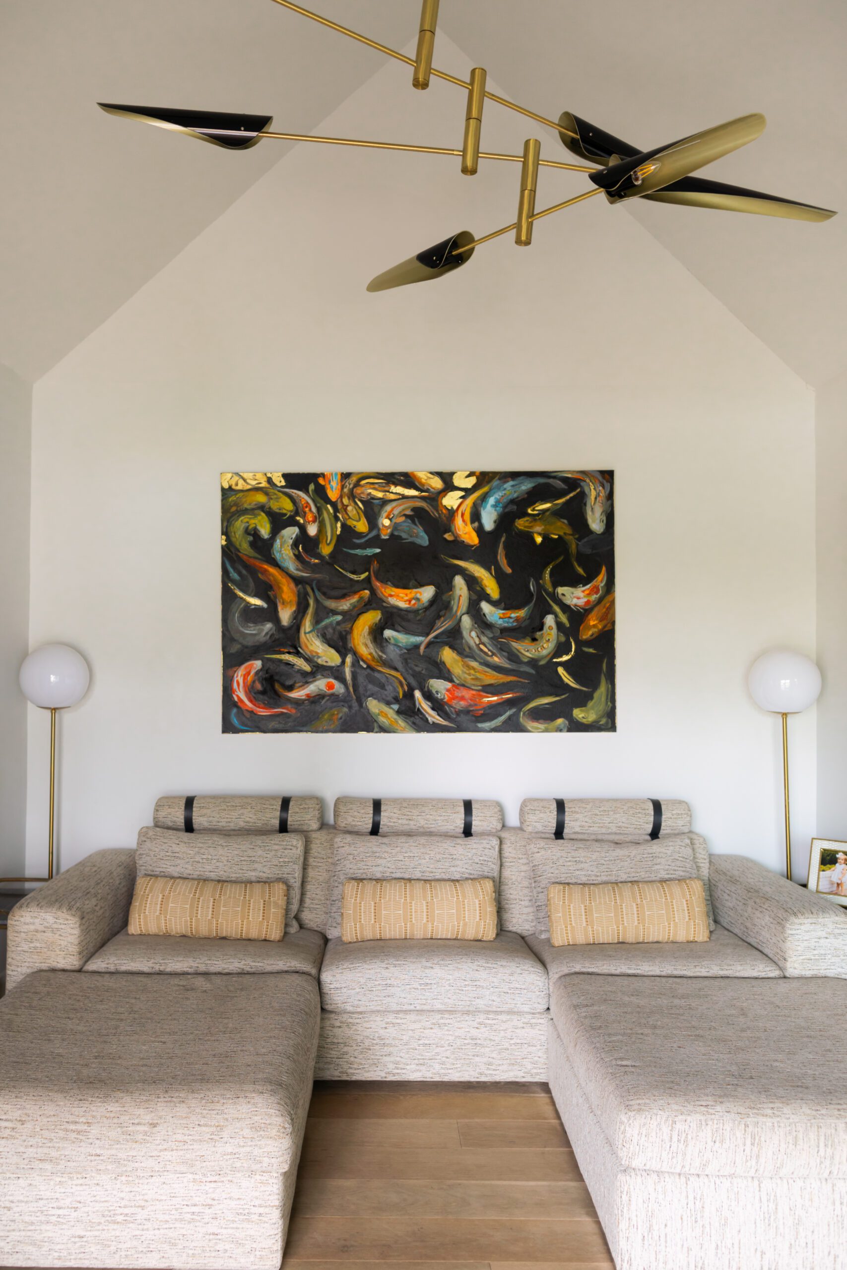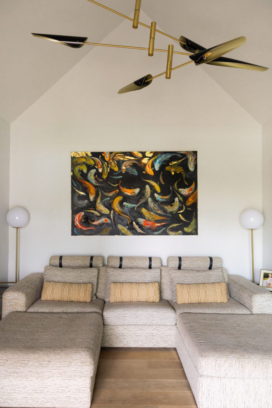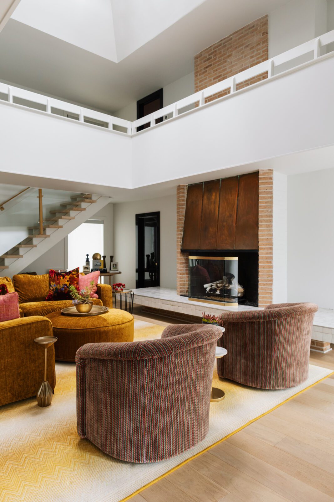 They also mixed new furnishings with vintage pieces, like the French Art Deco sideboard that sits tucked against a brightly wallpapered wall in the dining room. The sectional sofa from the family’s former home made the move with them, but it was reupholstered in a golden color that Cole describes as fitting with the “funky” feel of the whole home. “This house is just kind of moody,” he adds, “so we didn’t want the sofa color to be anything too light.”