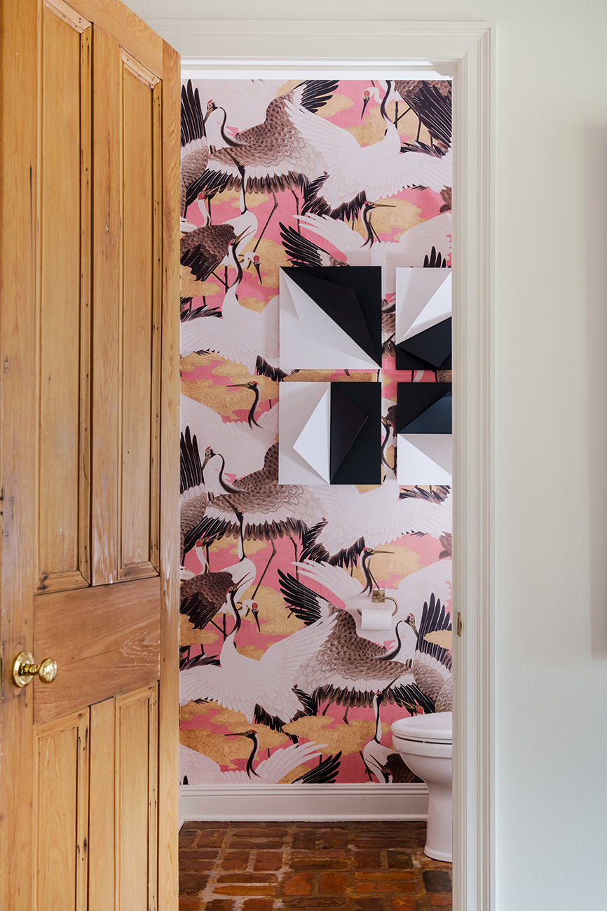 The vibe was built around a coral crane-patterned wallpaper for the powder room. St. Blanc was smitten with its golden sunset hues.