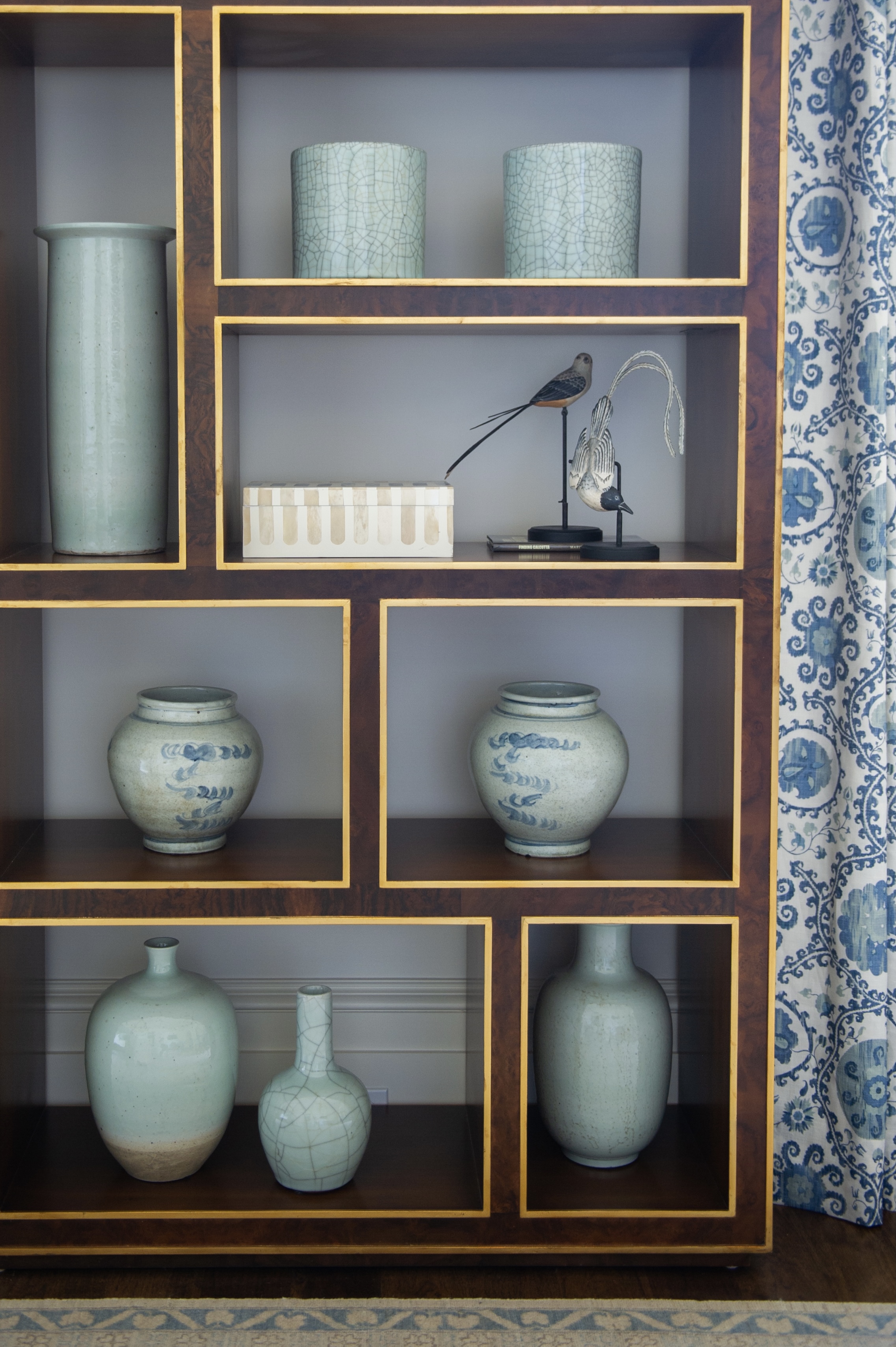 Of course, color is not confined to only bedding and fabrics. Landry says to carry your chosen hue into accessories and other elements in your space. For instance, her blue-themed assignment presented the perfect opportunity to showcase a collection of celadon trinkets. In the final design, azure-patterned curtains framed a display of the complementary blue-green vases.