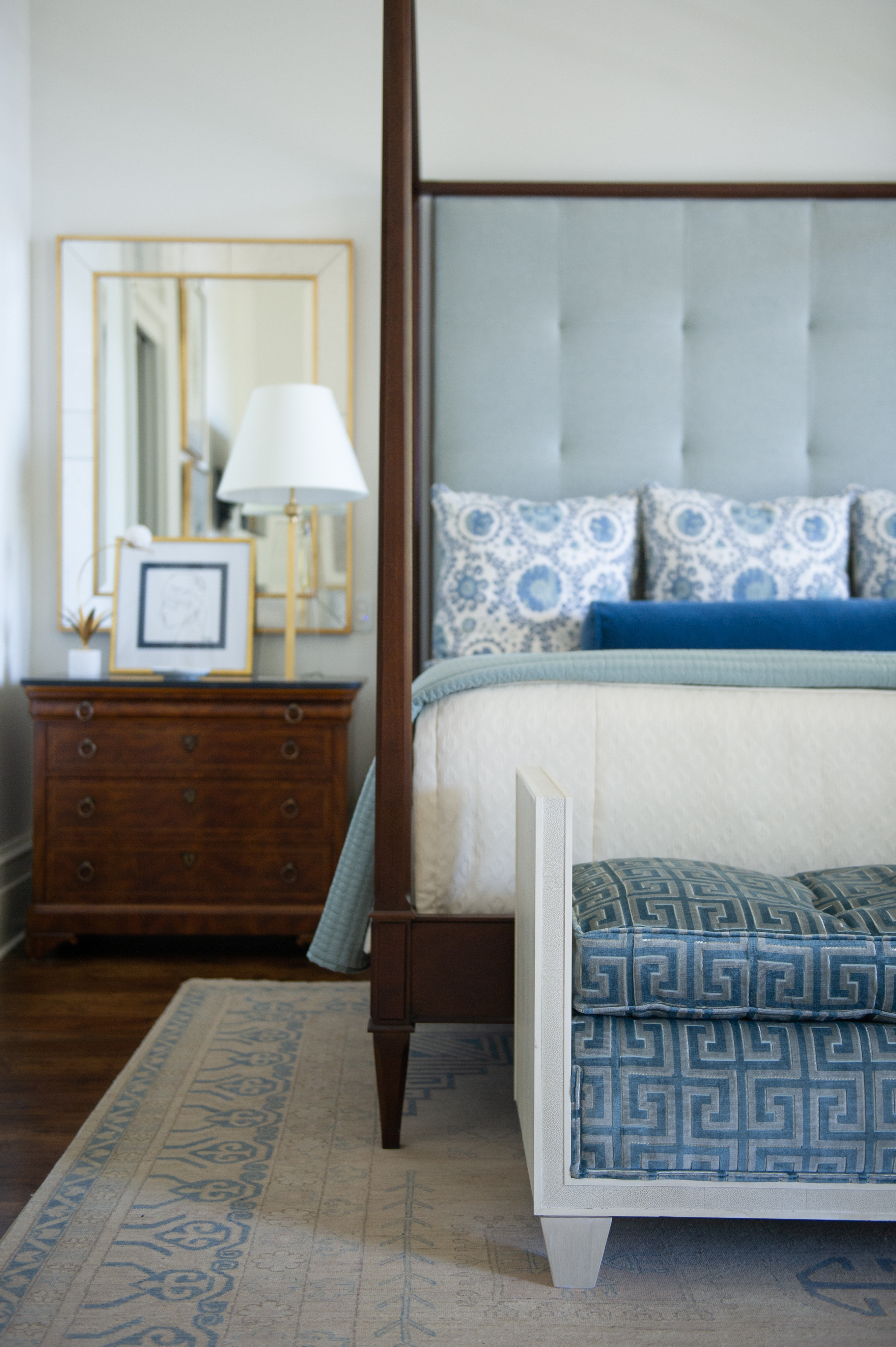“Different textures like the cut velvet on the shagreen bench at the foot of the bed give it variety and add interest,” Landry says of her design. “With a monochromatic scheme, contrast and varying the scale of patterns gives you a cohesive design that never falls flat.”