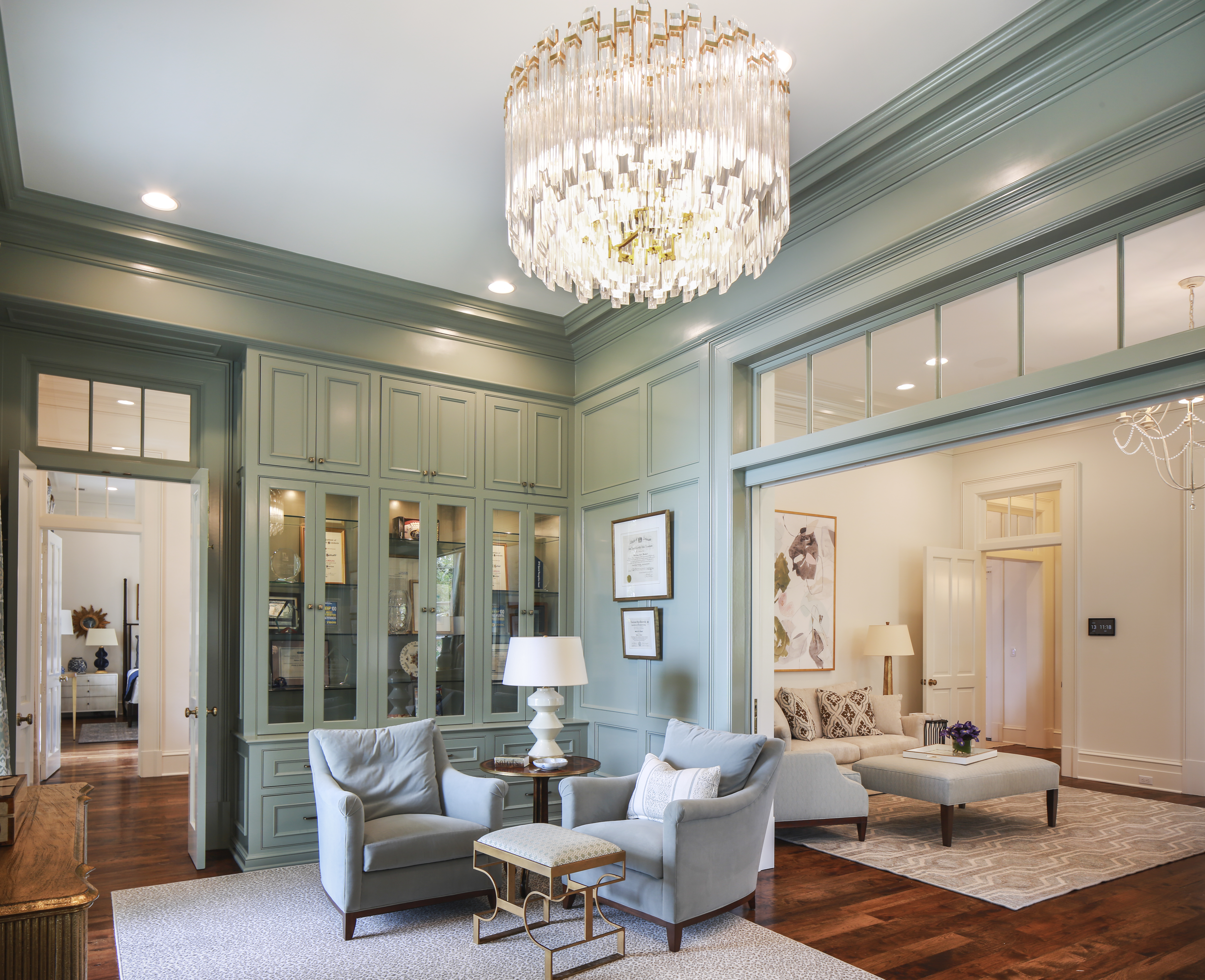The couple’s priority list of features for their new home included unobstructed views, a big room where family members could congregate, and a second, smaller living space for quieter moments. Cockfield helped ensure that the home’s scale and proportions would perfectly suit its classic style; each of the two stories has 12-foot ceilings, for example, instead of the more often seen 9 or 10 feet on the second floor, and the porch and balcony are a generous 12 feet deep. The architect also added traditional Southern details including dentil molding, pilasters and square columns, and ornate iron railings on the exterior, along with a graciously wide center hall and transom windows over interior doorways.