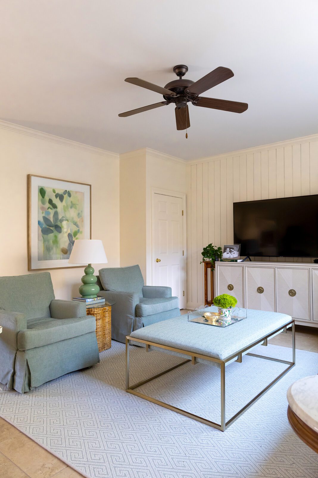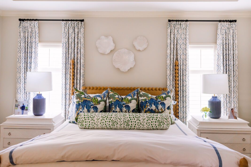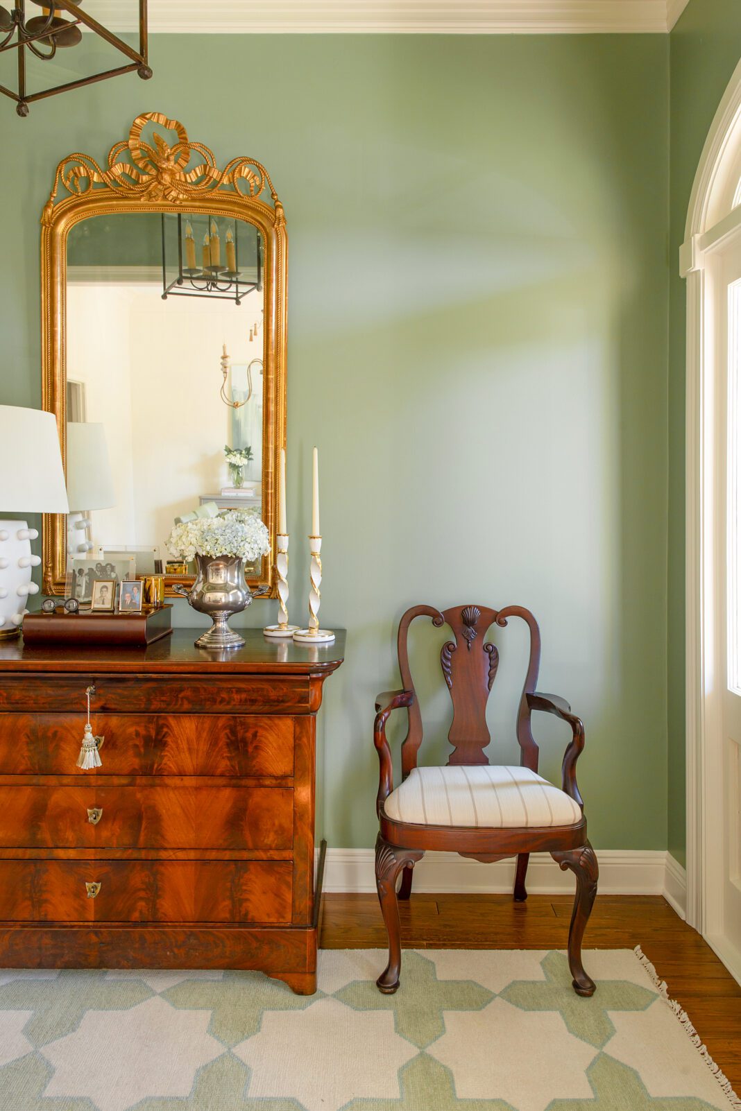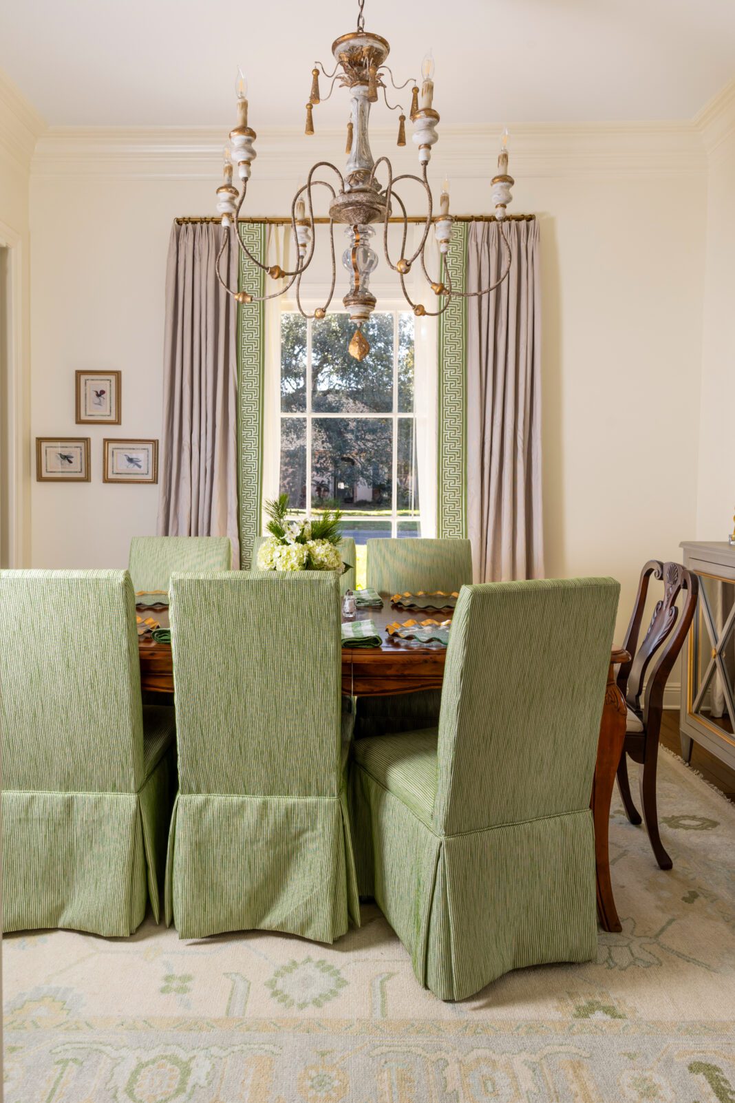 Emily fulfilled Caroline’s request for “a lot of color” in the design in a big way, beginning in the first space guests see when they walk through the front door. The walls of the entryway are awash in a deep green hue pulled from the pattern of the rug below, and green was carried into the dining room on chairs and the Greek key-banded curtains. “We were very excited about the green foyer,” says Caroline. “I knew I didn’t want all white, and color is just so comforting to me.”