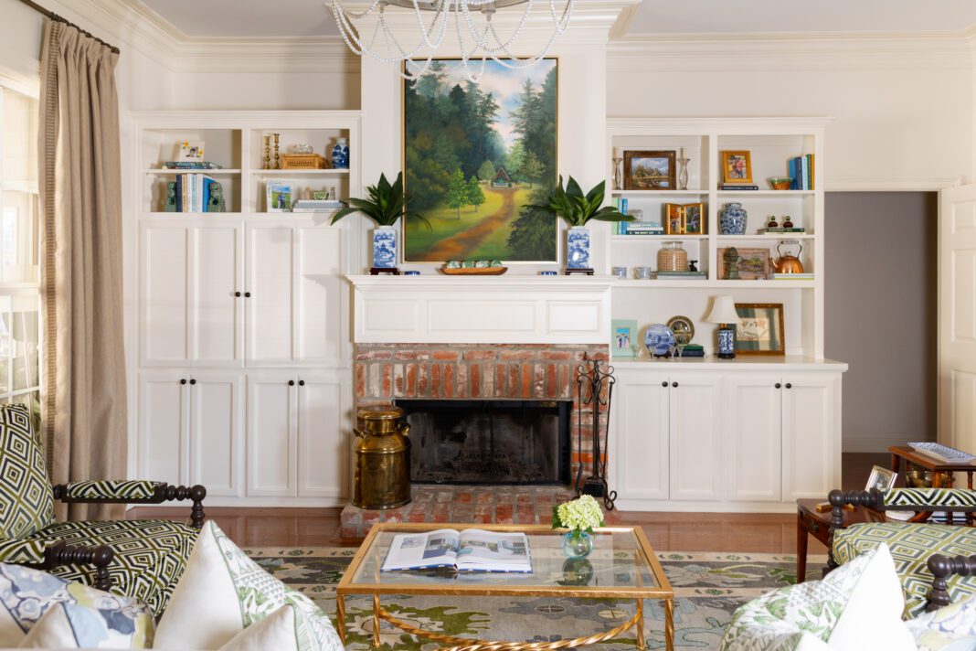 They also filled the rooms with family photos, art and decorative items that tied back to their roots. For the wall above the living room fireplace, friends of Spence’s parents gave the couple a painting of the gates of the boarding school he attended in Asheville, North Carolina. Perched on the brick hearth below is an old brass milk jug engraved with the name of Caroline’s grandfather, Auguste Arthur Bondy. A nearby end table came from Spence’s family.