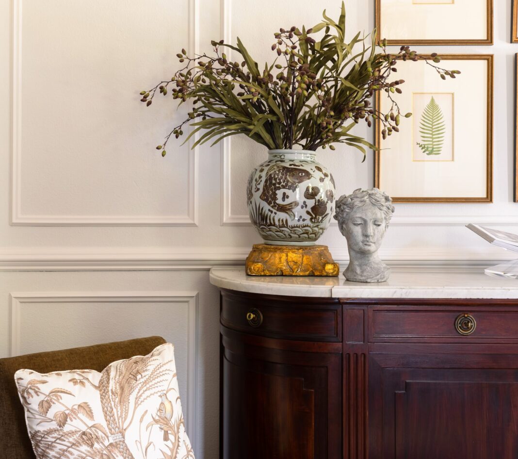 Throughout the spaces, a mix of antique and contemporary furniture pieces create an overall look that feels traditional and timeless but still current. Notably, Dellocono incorporated plenty of the homeowners’ existing pieces, from the gilded mirror that makes a statement in the dining room to artwork dotted throughout the two rooms and even the couch, which was reupholstered in a cream fabric by Stout Textiles