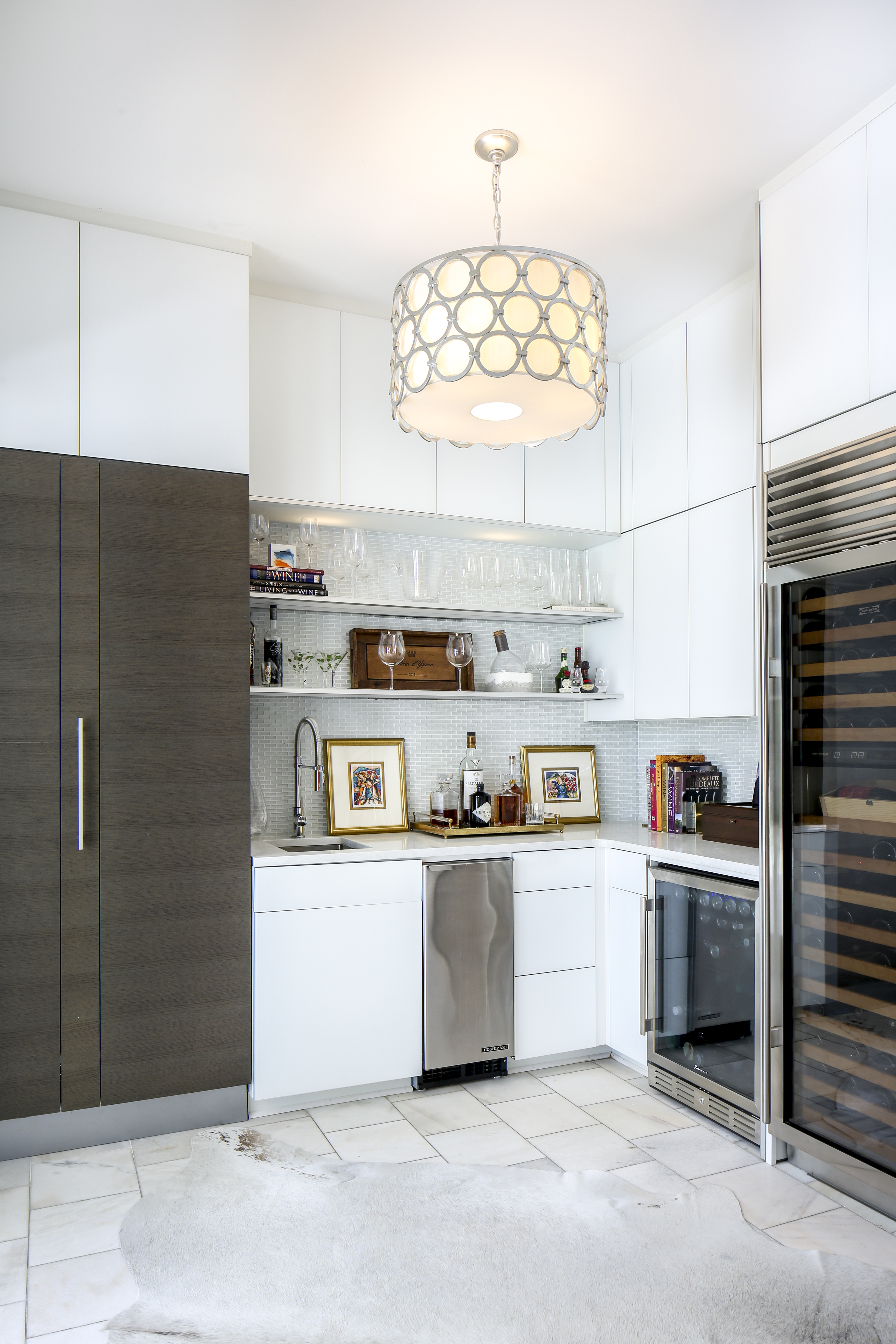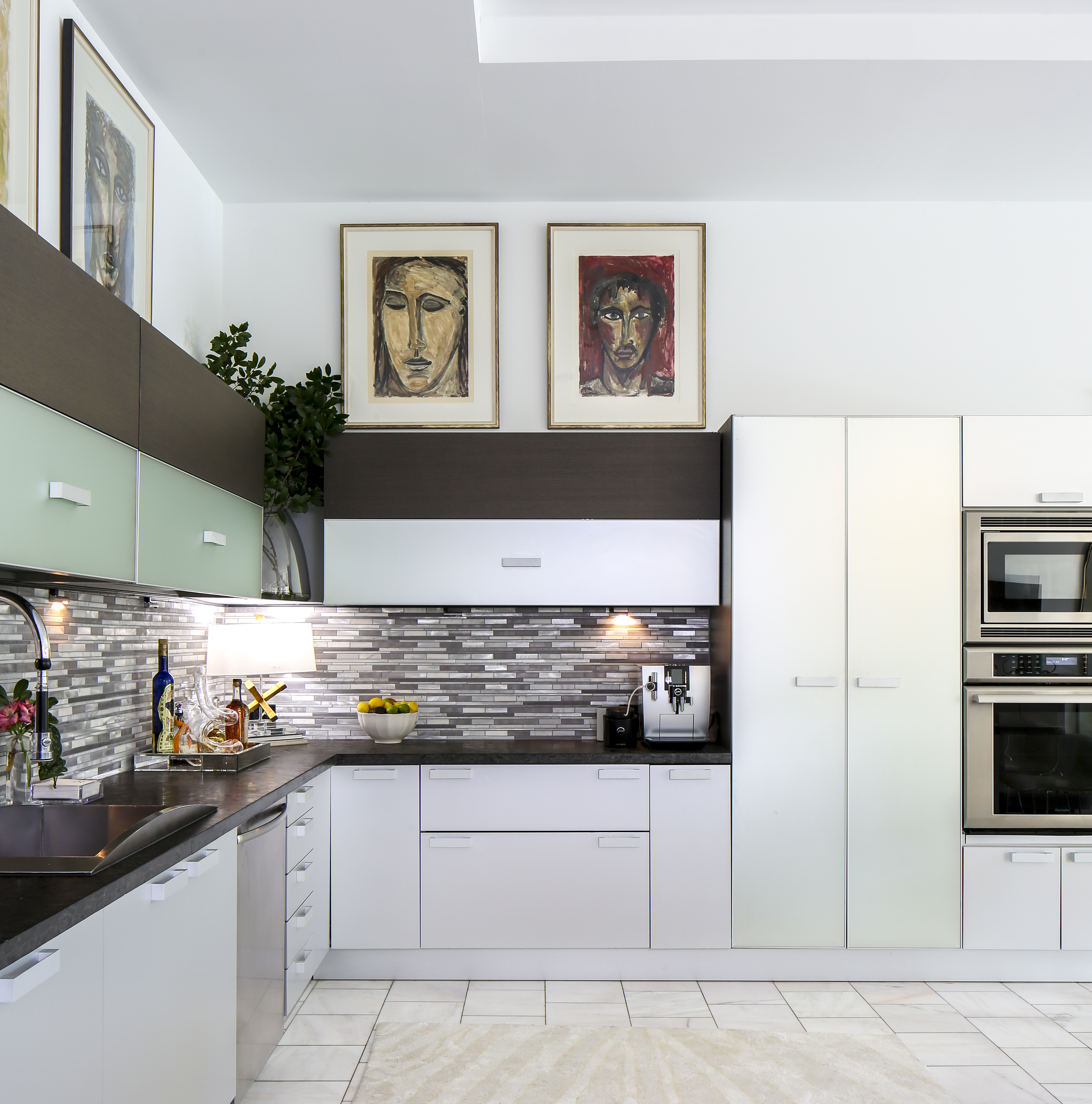 The existing kitchen—with its contemporary glass, metal and exotic wood cabinet panels—took a little more getting used to for Marsha. But a simple replacement of the dark granite backsplash with a new multi-hued linear version helped to brighten up this corner of the main open living and dining space. “Every kitchen we had before this was all white,” she says. “I hated this at first, but I have grown to love it. And James loves, loves, loves to cook in here.”