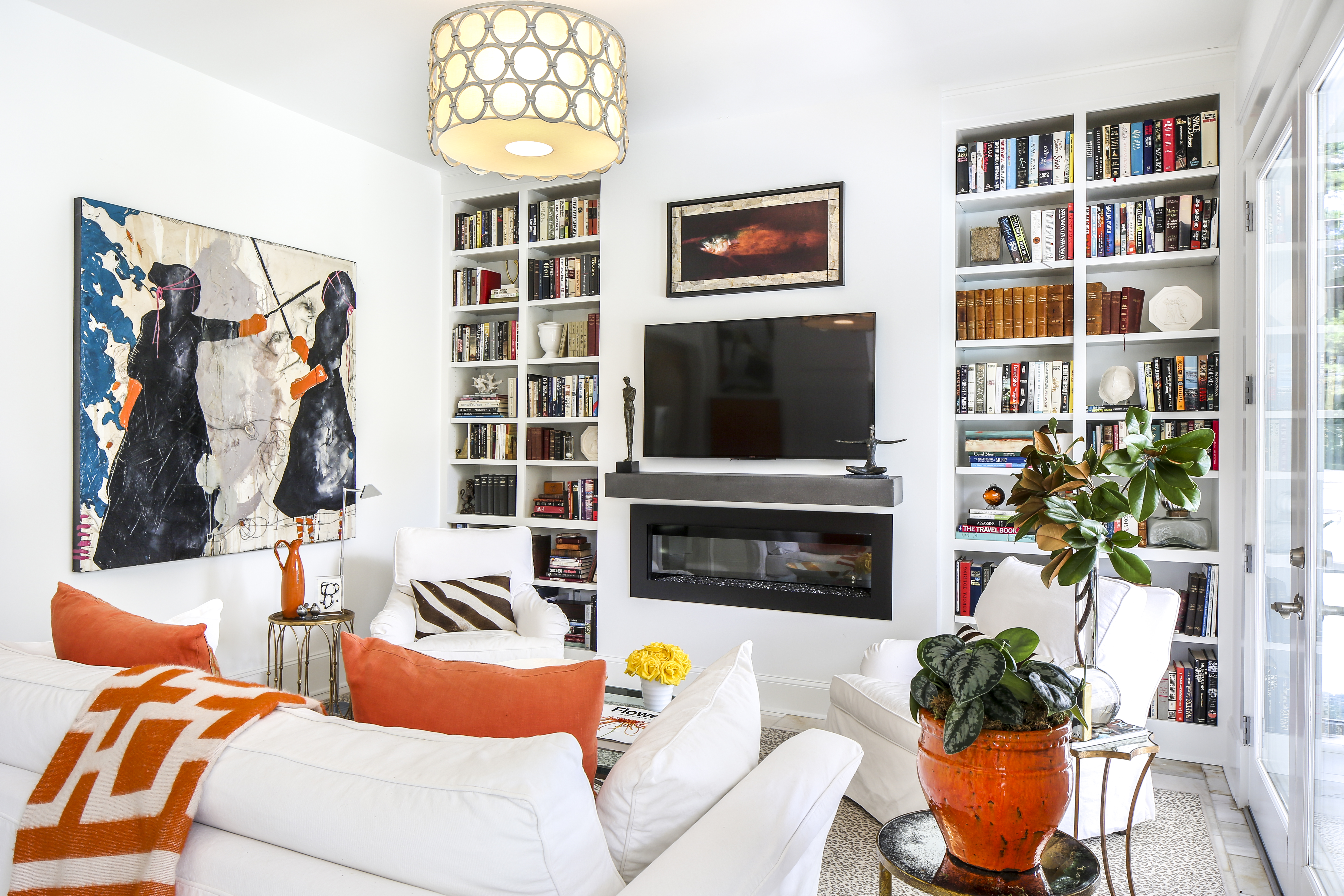 The features that made the Bakers fall in love with this home—streamlined structural details, an open floor plan, ample room for art, and an easy connection between indoors and out—are hallmarks of the tropical modern architectural movement made popular in Miami. In fact, this home was built a dozen years ago based on its original owner’s interest in the south Florida aesthetic. As is common in tropical modern-style homes, tall and wide windows and doors provide views of the landscape and water features from nearly every room, while polished marble covers the floors both inside and out. Warmer than typical modernism, the overall effect is a Zen-like atmosphere filled with natural light and focused on laid-back living.