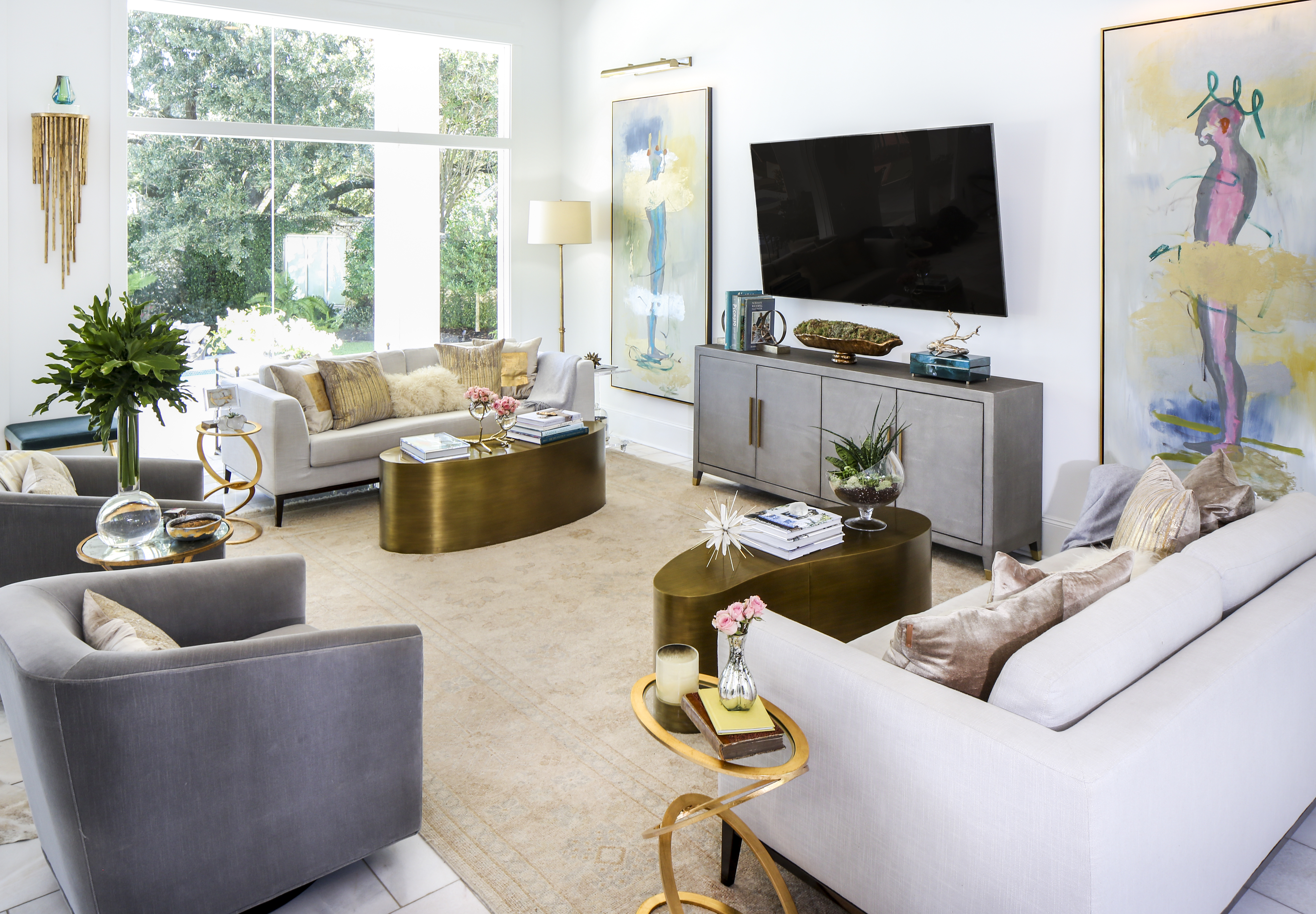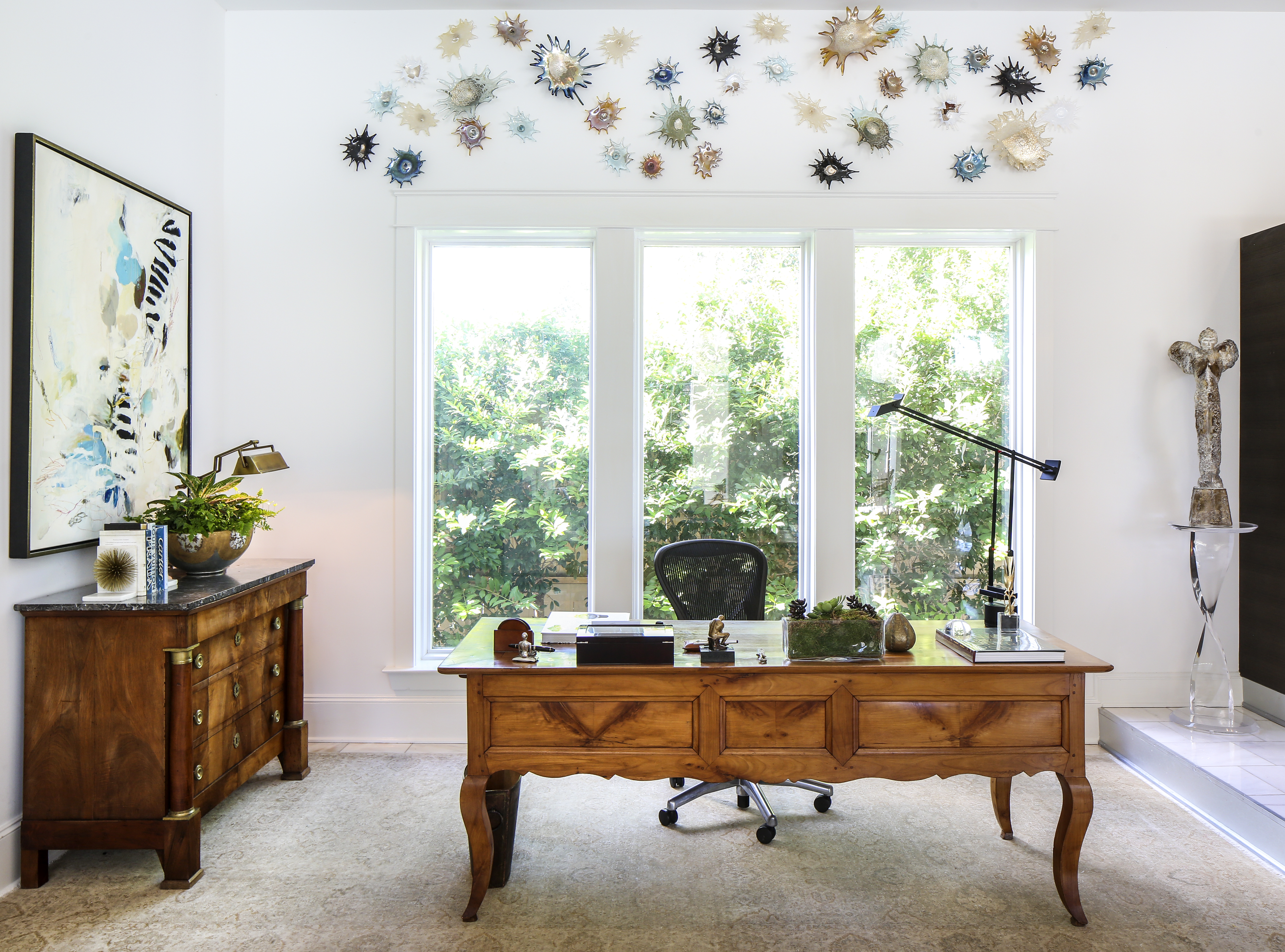 Though the couple’s former residences—this is their fourth home in the past nine years—were more traditional in style, this contemporary vibe was well-suited to their ever-growing art collection, which is weighted heavily with bold and abstract works. Empty white walls became like gallery spaces for displaying art found during their travels and other pieces by Louisiana artists discovered through Ann Connelly Fine Art in Baton Rouge and Soren Christensen Gallery in New Orleans. “We were able to use every piece of art we had,” Marsha says.