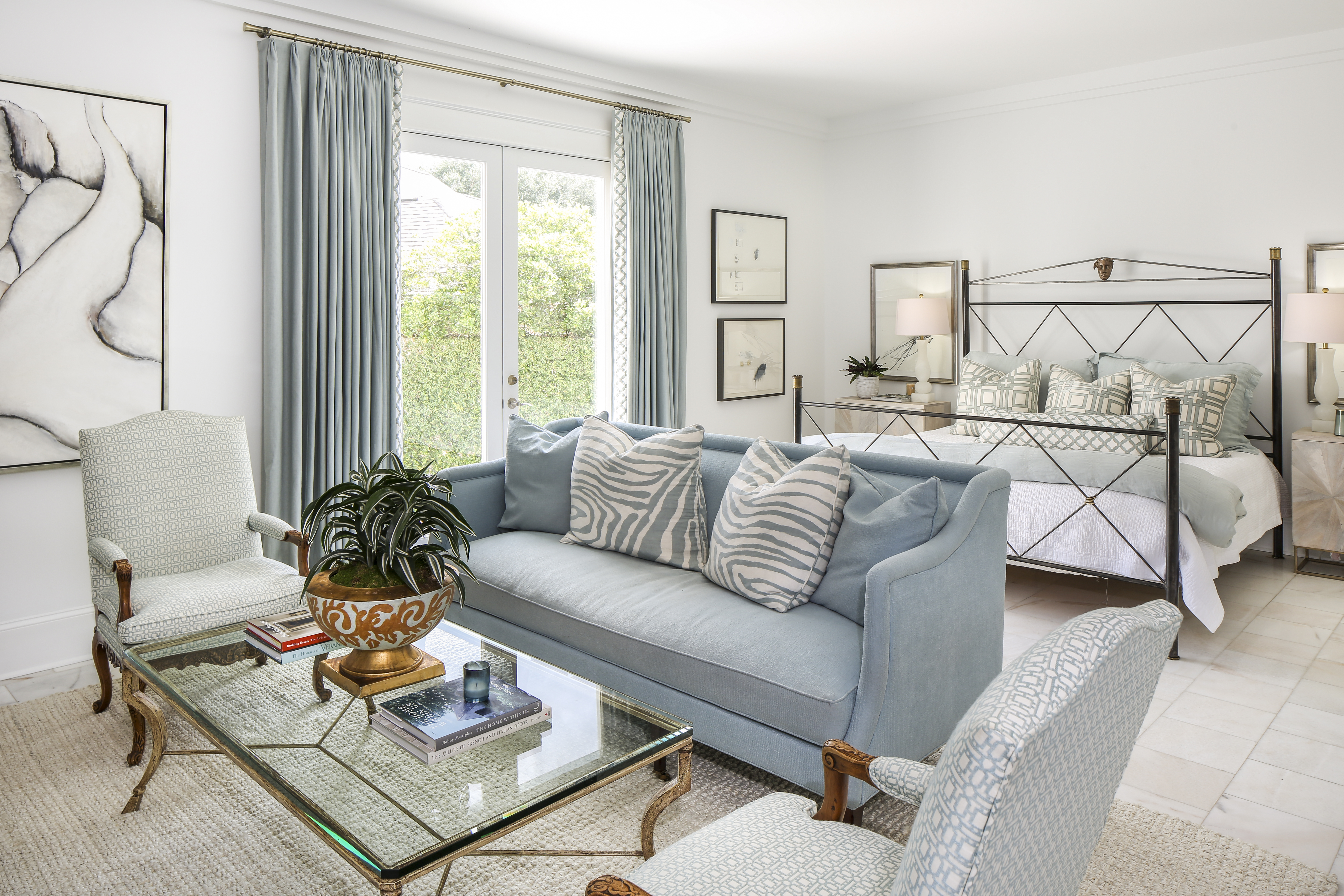 The Bakers called on builder Todd Normand of Bernhard Normand Construction to tackle the renovation of this home, which included moving a bar nook in the open main room to a separate living space, adding a fireplace and bookshelves to the opposite side of the room with the new bar area, and reimagining the master bath to include a sleek vanity alcove. Designers Helaine Moyse and Patrick Tandy, with whom the Bakers have frequently collaborated over the years, advised on the proper integration of the couple’s existing classic furnishings with more contemporary new pieces. An example of their success is in the dining area, where an 8 x 8-foot abstract painting by Meredith Pardue is flanked by Venetian glass sconces and juxtaposed with a weathered antique Spanish dining table.