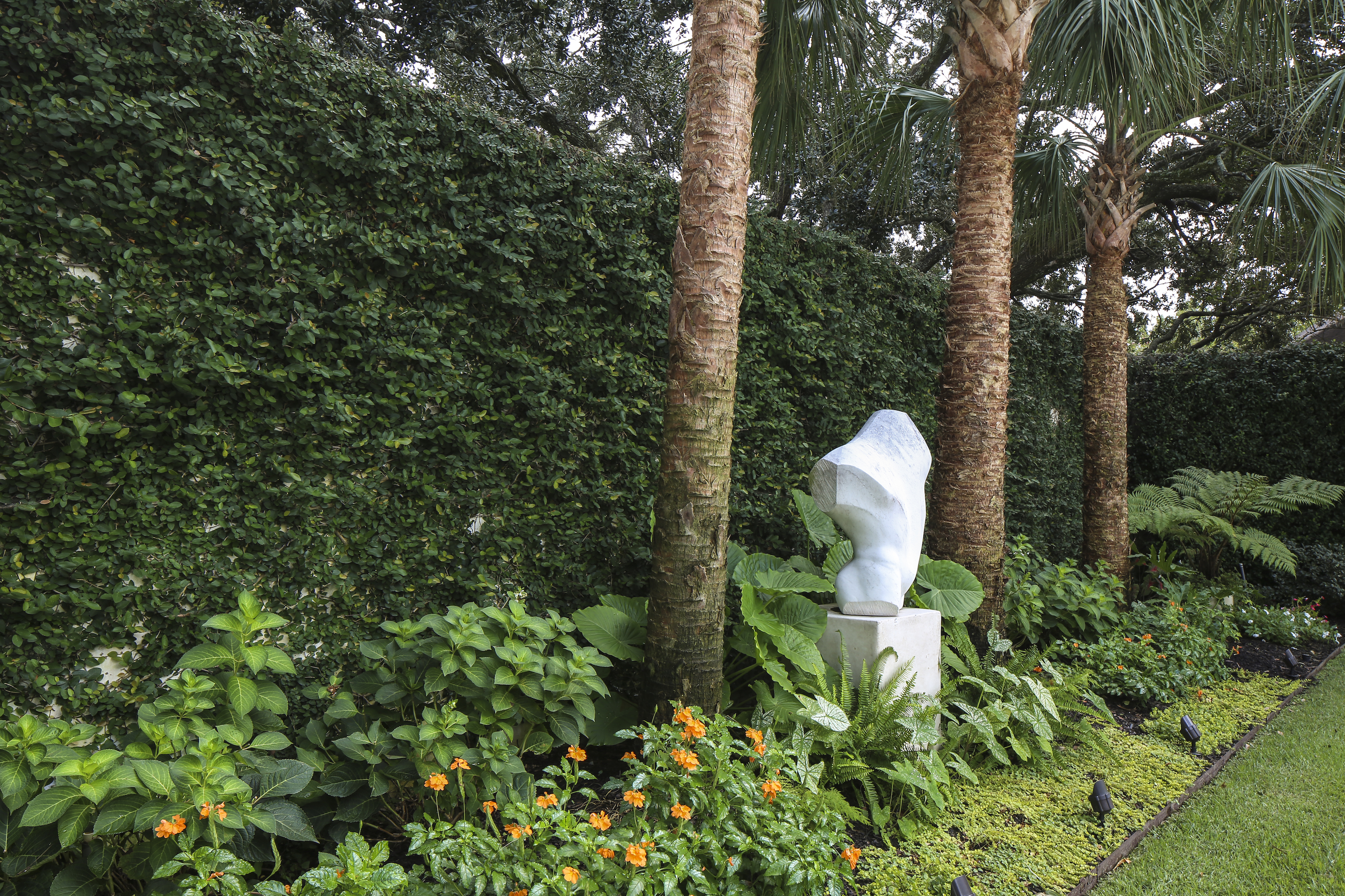 “We walked in that afternoon, and this was what we saw,” James says, looking out the massive windows of the house toward a lush private garden and dramatically designed pool. “On Saturday, we were thinking we would build a house on the other side of town, and by Monday, we had made an offer on this one.”
