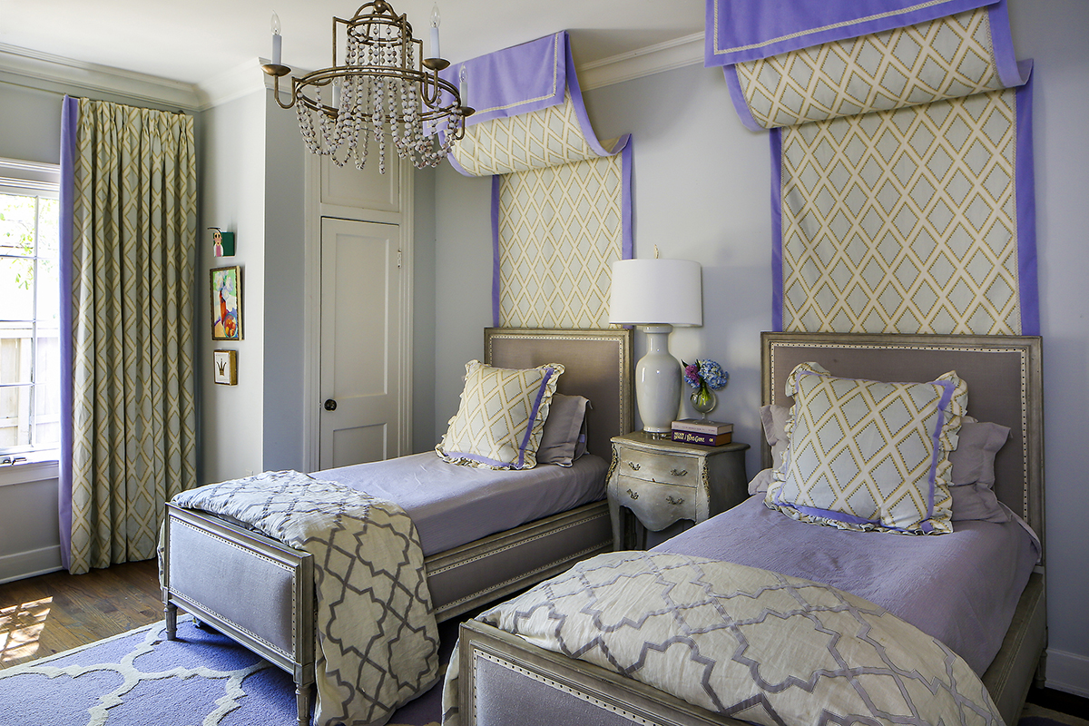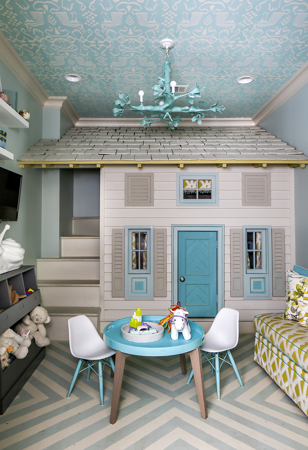 Another unexpected element of the house is hidden behind folding doors in the den: a fanciful, color-filled playroom that features a built-in cedar-roof playhouse. Lauren painted the chevron pattern on the floor here herself, and 5-year-old daughter Palmer’s artwork hangs on the wall. Space is reserved for a future creation by the couple’s son Monroe, who was born just a few days after the renovation project was complete and the couple moved into the house. “I fought hard for this playroom,” Lauren says with a laugh. “It’s a perfect place for the kids to play and for us to still be able to see them.”