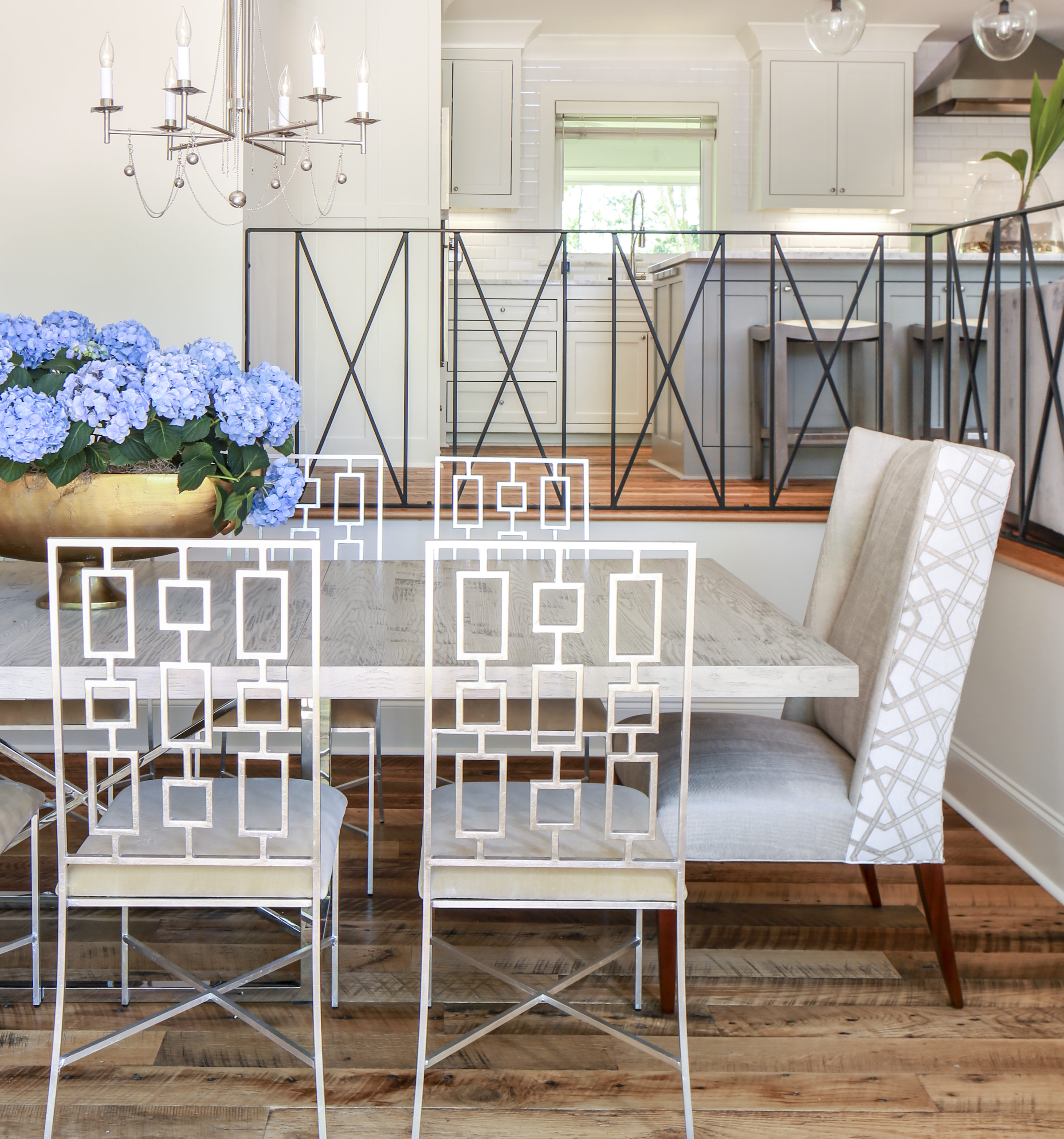 After the film crews cleared out and the house was officially theirs, the LaNasas turned to architect Georgia LaNasa, Matt’s sister, to design the reimagined interior rooms along with interior designer Anne McCanless. Retaining the split-level concept, the crew took the house down to the studs and opened up the walls that closed off the galley kitchen, using only a new iron railing from DiStefano Designs & Fabrication to separate the cooking space from the dining room and the views of the backyard and lake.