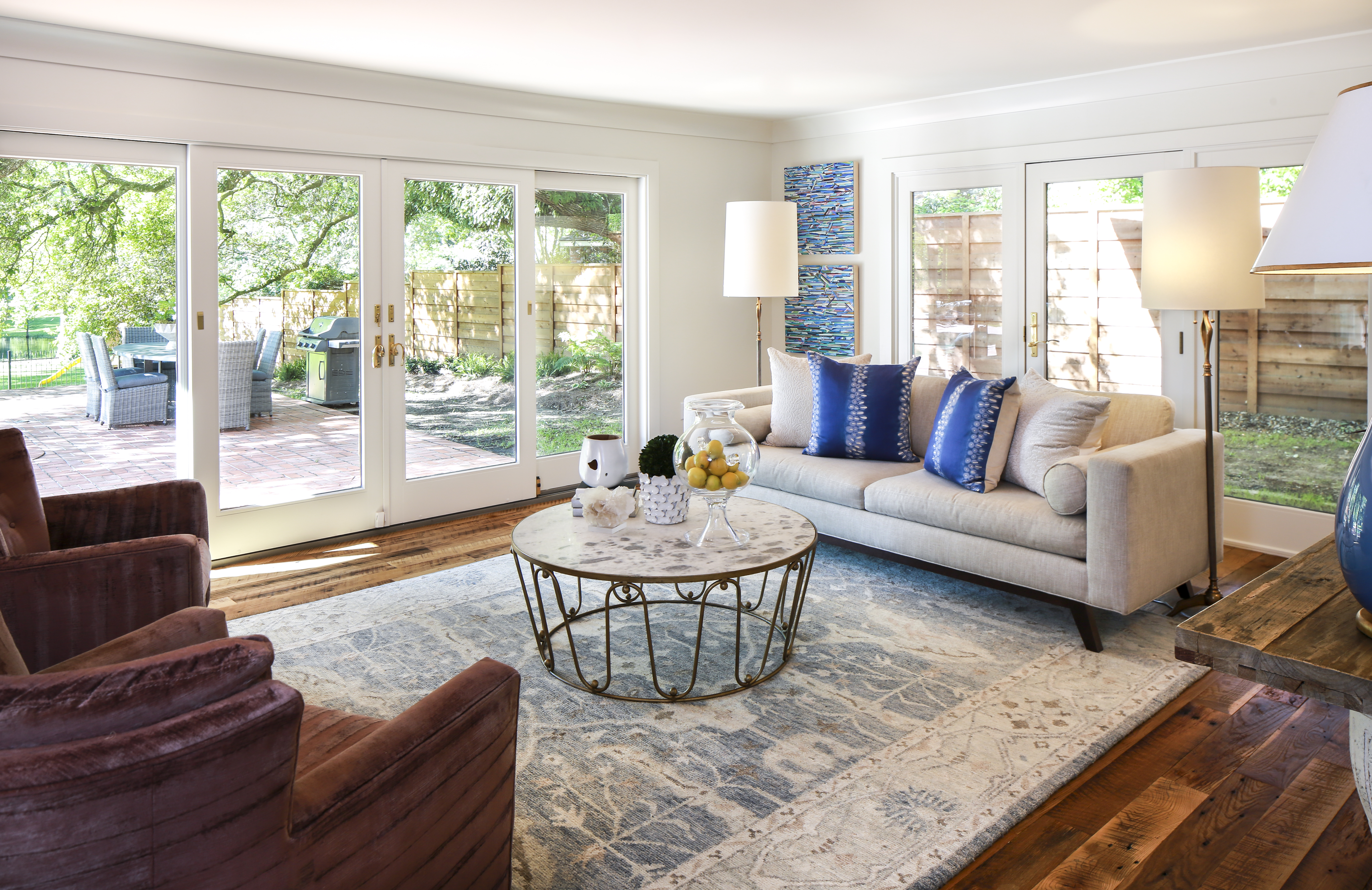 McCanless chose contemporary-lined seating pieces to nod to the home’s architecture, and she had them covered in spill-proof Sunbrella fabrics that are as friendly to little fingers as they are to the family’s two Labrador retrievers. The durable material also makes it easy to do what this open-concept house does best—entertain friends and family.